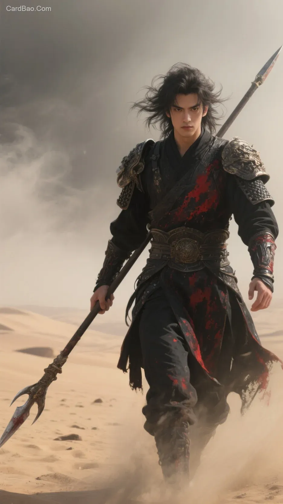 风卷乱发,他手持长矛,眸光如电。墨色战甲染就斑驳红痕,似是往昔战火余烬。那柄长剑,半身特写,历经风霜,面向镜头行走,背景是一片沙漠背景大雾弥漫,高清渲染,脸部清晰,细腻画质,明暗对比,艳丽的油画质感,细腻肌理,超级精细CG,超高清,最高画质,写实逼真,面部阴影,面部聚焦,丰富细节,朦胧感,高级感,光影美学,发型光,发丝光,伦勃朗光,精美繁复华丽风格,CG厚涂,32K高清画质,32K细腻真人皮肤纹理。