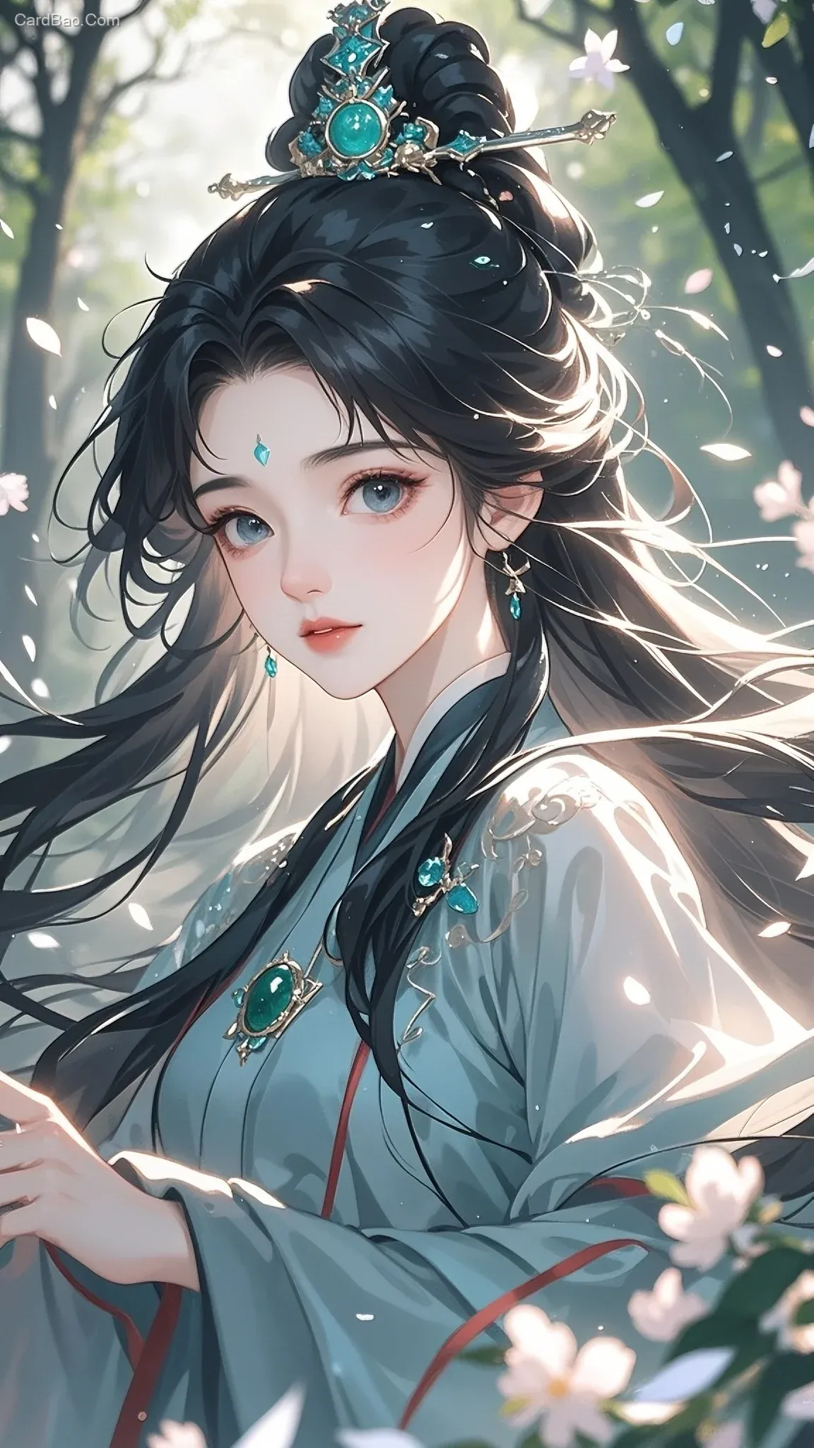 新三维古风,仙女,肤若凝脂,墨发垂落,发间一支墨玉发簪,清风拂过,吹得头发乱七八糟,水灵灵的大眼睛,炯炯有神,高洁神圣之感,颗粒粒子厚涂,生物发光,粒子发光,倾城绝色。