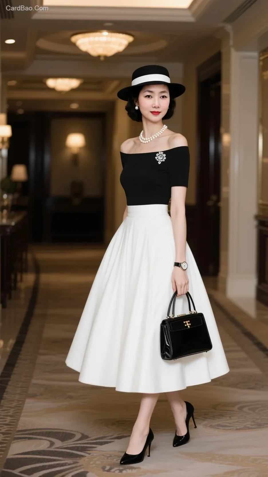 A Chinese beauty dressed in Audrey Hepburn-style attire, wearing a black off-shoulder short-sleeved top paired with a white full-skirted A-line skirt. A chic diamond brooch is pinned on the left side of her chest, and she wears a small black hat adorned with a white pearl band. A pearl necklace graces her neck, and a watch adorns her wrist. She stands elegantly in a hotel lobby, wearing black high heels and carrying a refined black handbag in a full-body shot.