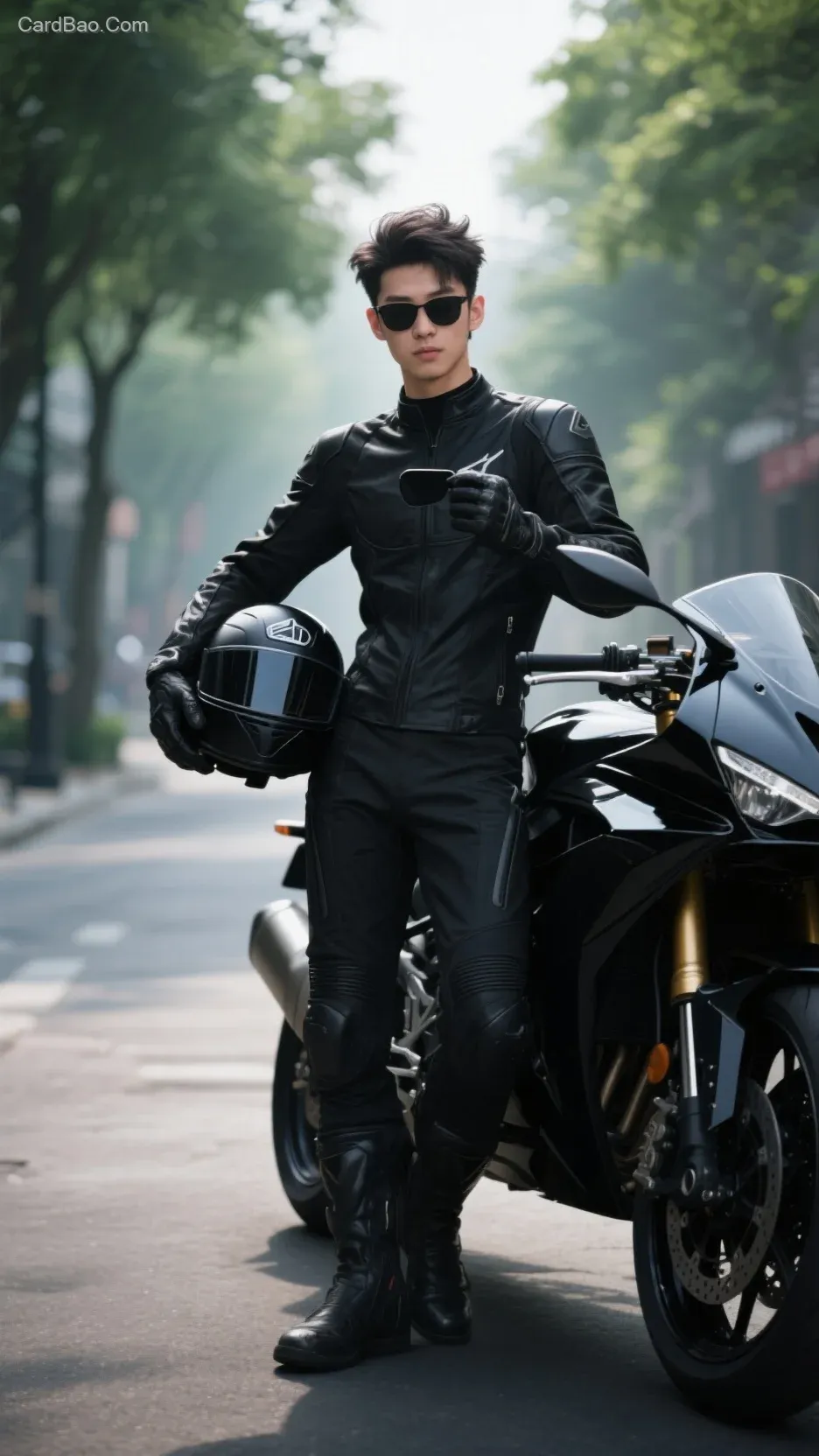 Outdoor scene with blurred green trees and streets, featuring a handsome young biker with a stylish haircut, dressed in all-black motorcycle-style attire. He is holding a black helmet under his right arm and a pair of fashionable sunglasses in his left hand, leaning against a shiny, sleek black motocross bike. The image is a 3D finely modeled, CG-rendered scene in a semi-realistic style, presented as a high-definition, frontal, close-up half-body shot.