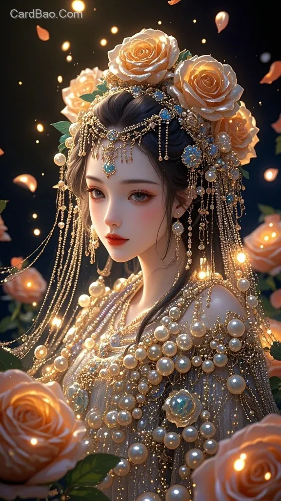 一个由粒子组成的中国古代美人厚涂特写,插画风 美艳动人,玫瑰花精灵,流萤花瓣漫天飞舞飘落,珍珠堆砌覆盖掩埋,超多流苏超多发饰超多细节超级震撼好看的光效,幻境场景,微小粒子发光生物发光金色闪片透明流体C4D,OC渲染,质感通透,模糊边缘,双重影响,伽马射线捕捉,背景各种玫瑰花