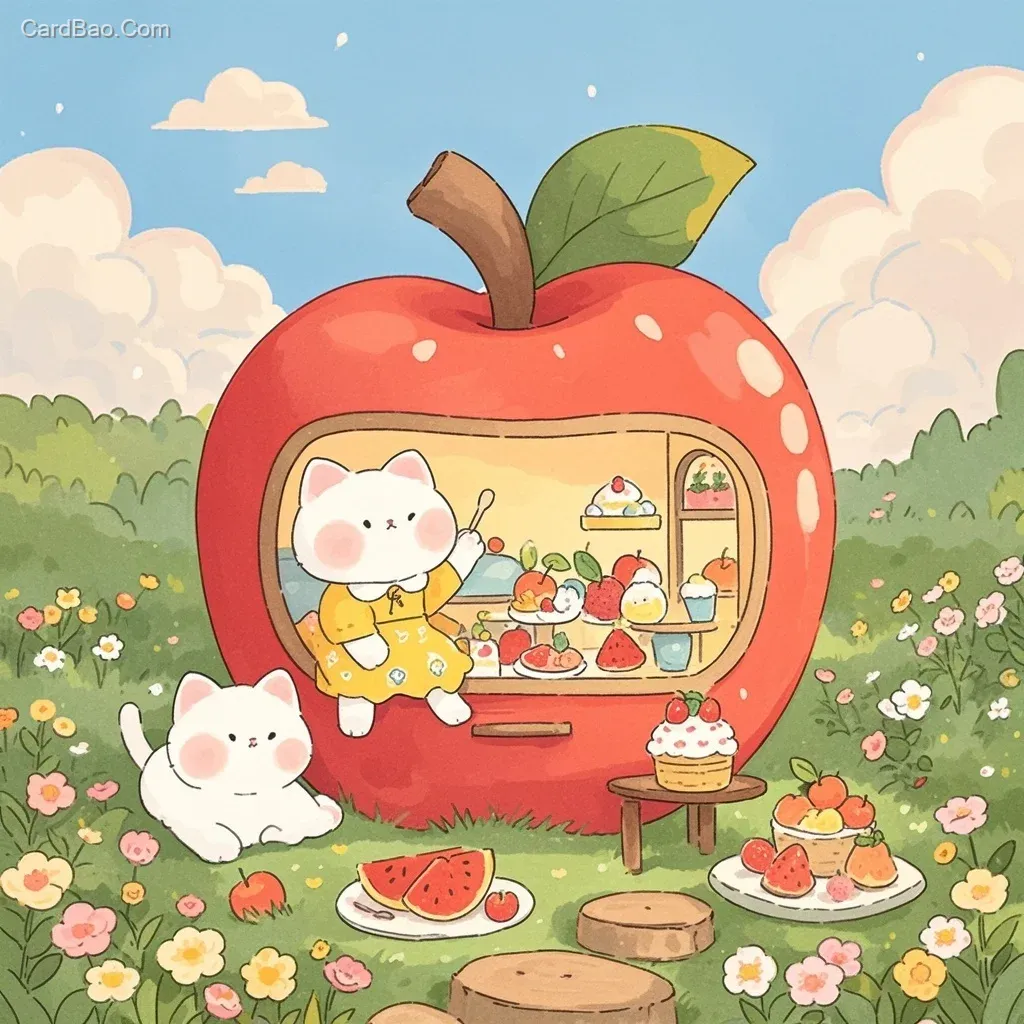 插画,治愈系,卡通,简笔,线条勾勒,俯瞰,可爱的苹果造型房子,窗口里面站着一只白色的穿黄裙子的猫咪,房子周围装饰了很多水果和甜品,小猫在晒太阳,房前的草地上一直猫咪翘着二郎腿睡觉,蓝天白云,前景长满了五颜六色的花,细节很多,高清,