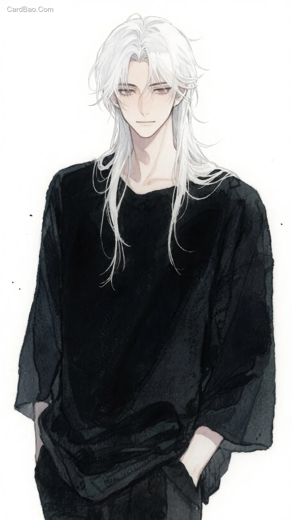 漫画水彩风格,男,清冷感,白发偏长,痞帅,侵略性,黑色简约慵懒衣服,简约色系,高冷傲娇