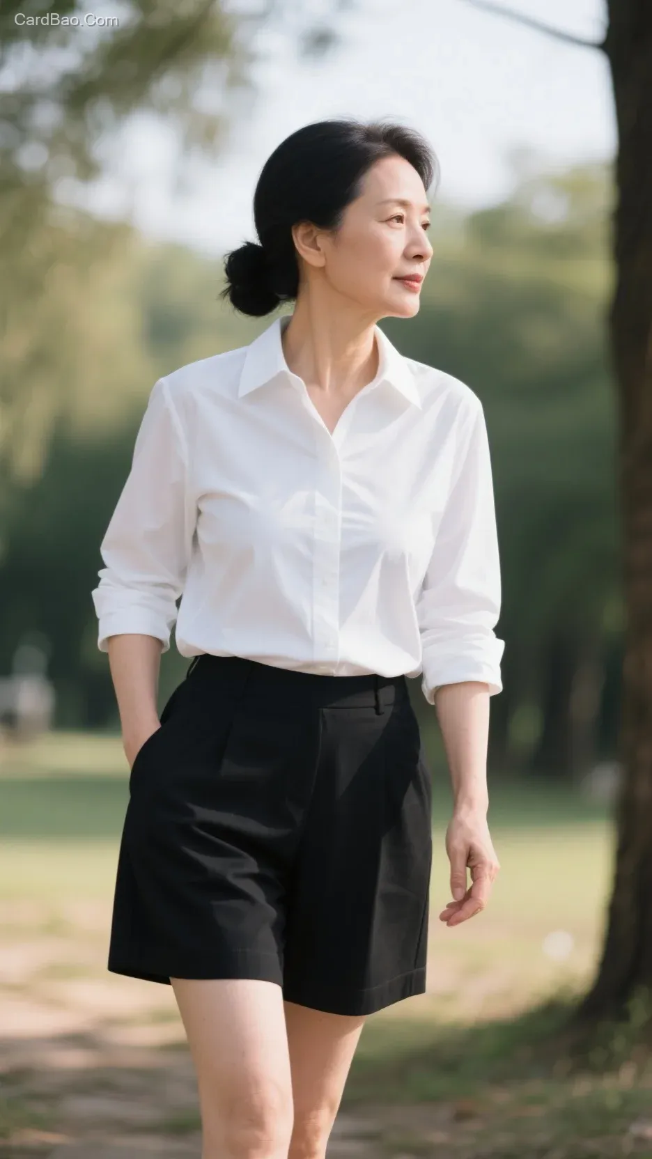 • Top: A crisp white shirt, simple and sharp, with a collar and half-rolled cuffs, maintaining a formal feel while adding a relaxed vibe—like a fusion of workplace polish and outdoor ease.
