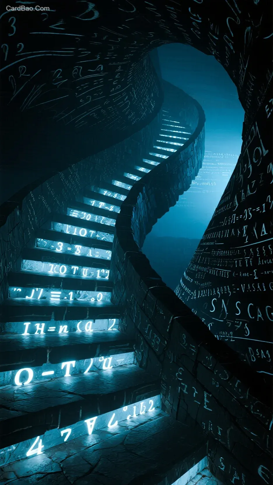 由无数复杂数学公式构成的神秘长梯,螺旋状蜿蜒通向幽暗深处,仿佛连接着知识与未知的界限。超广角镜头捕捉这壮观景象,强调其宏伟与深度。写实逼真的风格让每一个符号、每一道光影都显得异常清晰,仿佛观众能触摸到那些发光的石阶。画面以深邃的蓝黑色为主调,营造出一种探索未知的氛围,同时突出公式的白色线条,形成强烈对比。超现实主义与科学幻想的完美结合,引领观者踏上一场智慧与勇气的冒险之旅。近景至远景的视觉冲击,让人感受到知识海洋的浩瀚无垠。