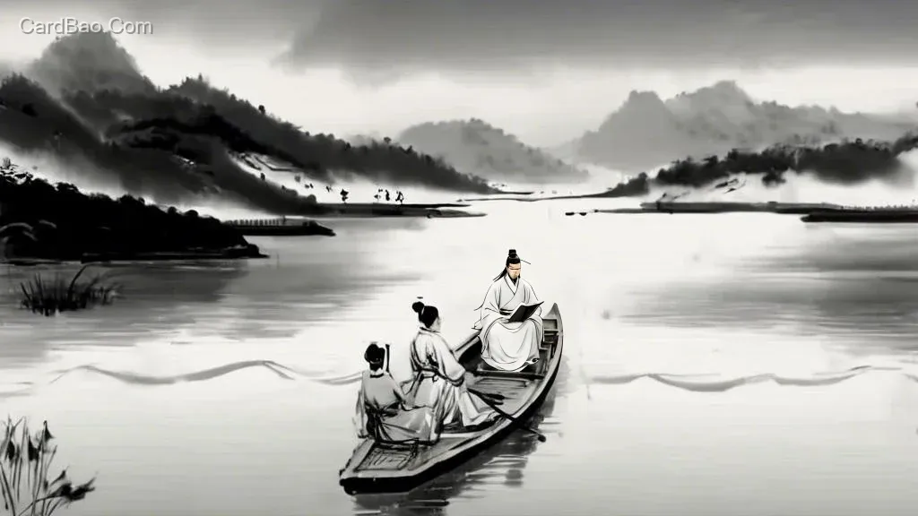 Wang Bo, dressed in a white robe, sits at the bow of the boat facing the camera, intently reading a book in his hands.