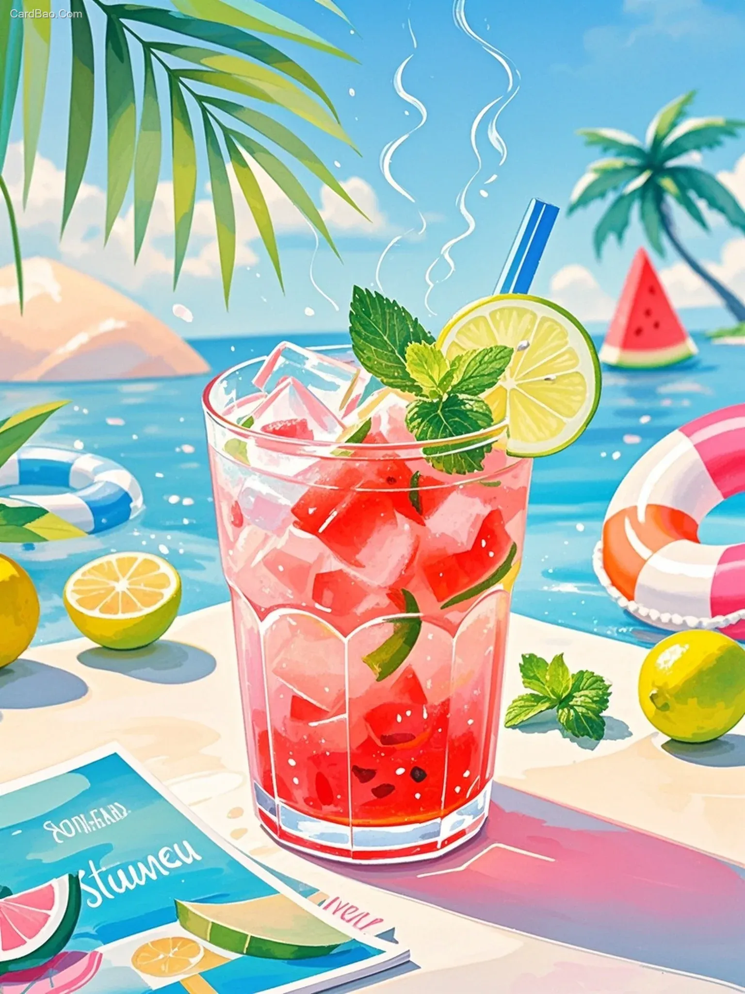 Summer ice drinks, crushed ice, watermelon, mint, lemon, refreshing, watercolor illustration style, high-definition
