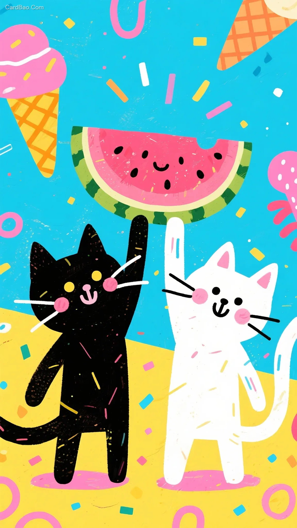 潮流艺术涂鸦,拼贴,可爱的风格,儿童插画,故事感,一只黑猫和一只白猫一起高举着一块巨大的西瓜,背景蓝中带粉黄,冰淇淋图案,气氛欢快,插图风格,噪点丰富细腻,饱和度高,色彩变化丰富,