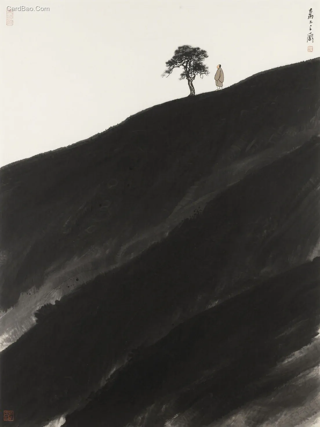 仰视山坡,一棵树,旁边一个人,人很小。写意,黑色,空灵,禅意,大面积留白