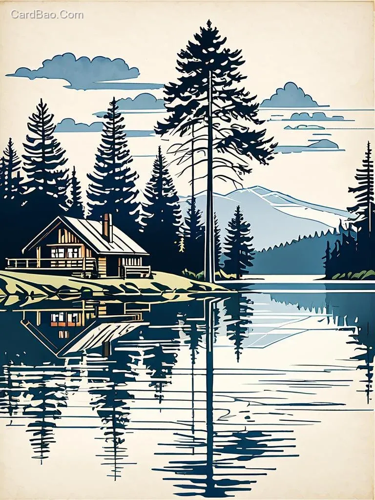 1. Overall Composition: Use a mid-range composition with the lake positioned at the center of the image, surrounded by forests. Small wooden cabins are artfully distributed along the lake's edge and at the forest entrances, leaving space above to depict the sky, creating an open and harmonious visual effect.