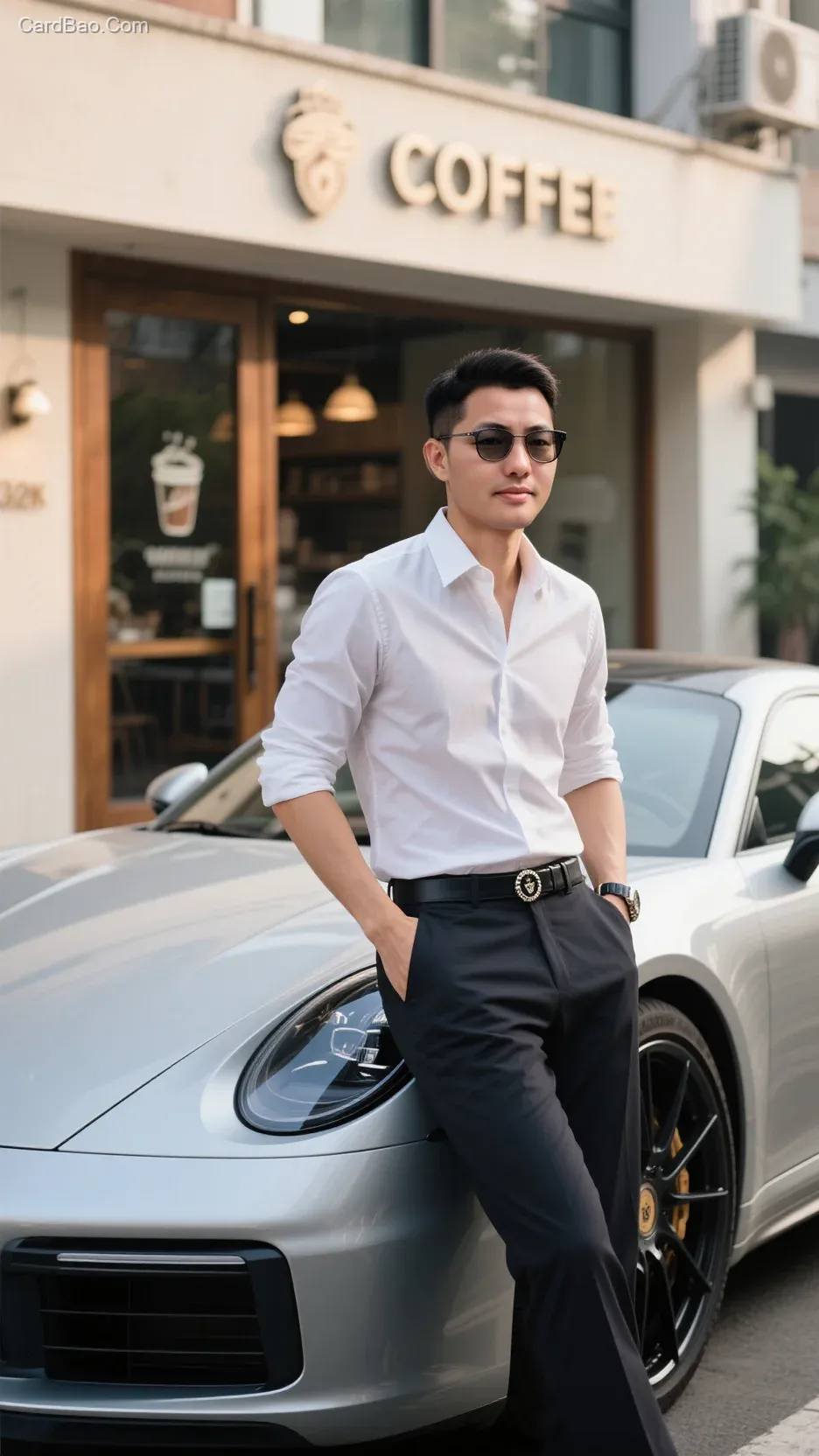 ## Realistic portrait photography, featuring an Eastern handsome man with a muscular build and strong masculine charm. He wears a finely tailored designer shirt with rolled-up sleeves, a luxury belt, and dark sunglasses. His face has delicate features, a charming smile, and a stylish buzz cut, with smooth skin. He leans gracefully against a sports car, hands in pockets, wearing a Rolex. The background is a café entrance, with perfect attention to detail. Medium shot composition, rendered with extreme precision for ultimate image quality. A masterpiece with perfect framing, high clarity, high saturation, and premium 32K resolution.