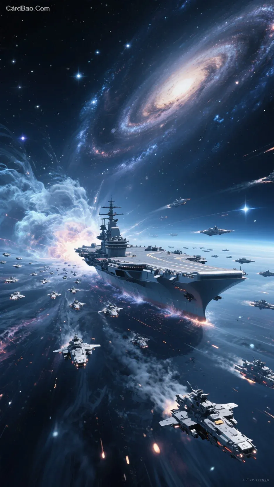 Avant-garde art, visual design, sparkling stars in the night sky, flowing Milky Way, particle storm, a massive aircraft carrier leading countless warships charging into battle, advancing toward the depths of space, a panoramic composition, dynamic visual movement, in the style of Liuhua, fluid and planar aesthetics, awe-inspiring spectacle, high-end and exquisite beauty. High-definition, cinematic lighting and texture, ultra-high resolution, 16K detail rendering, 3D.