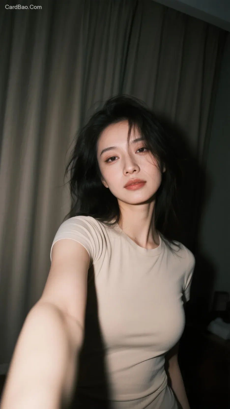 一位绝美御姐,皮肤哑光细腻,发丝凌乱,穿着浅色紧身短袖,在昏暗房间纯色窗帘背景下进行现代自拍,伤感微笑,眼神疲惫,自拍抖动模糊,自拍用途照片,特写,轻微仰角镜头且偏斜,前置摄像头构图,杂乱柔和非均匀光线,胶片质感,轻微噪点,生活真实无修饰