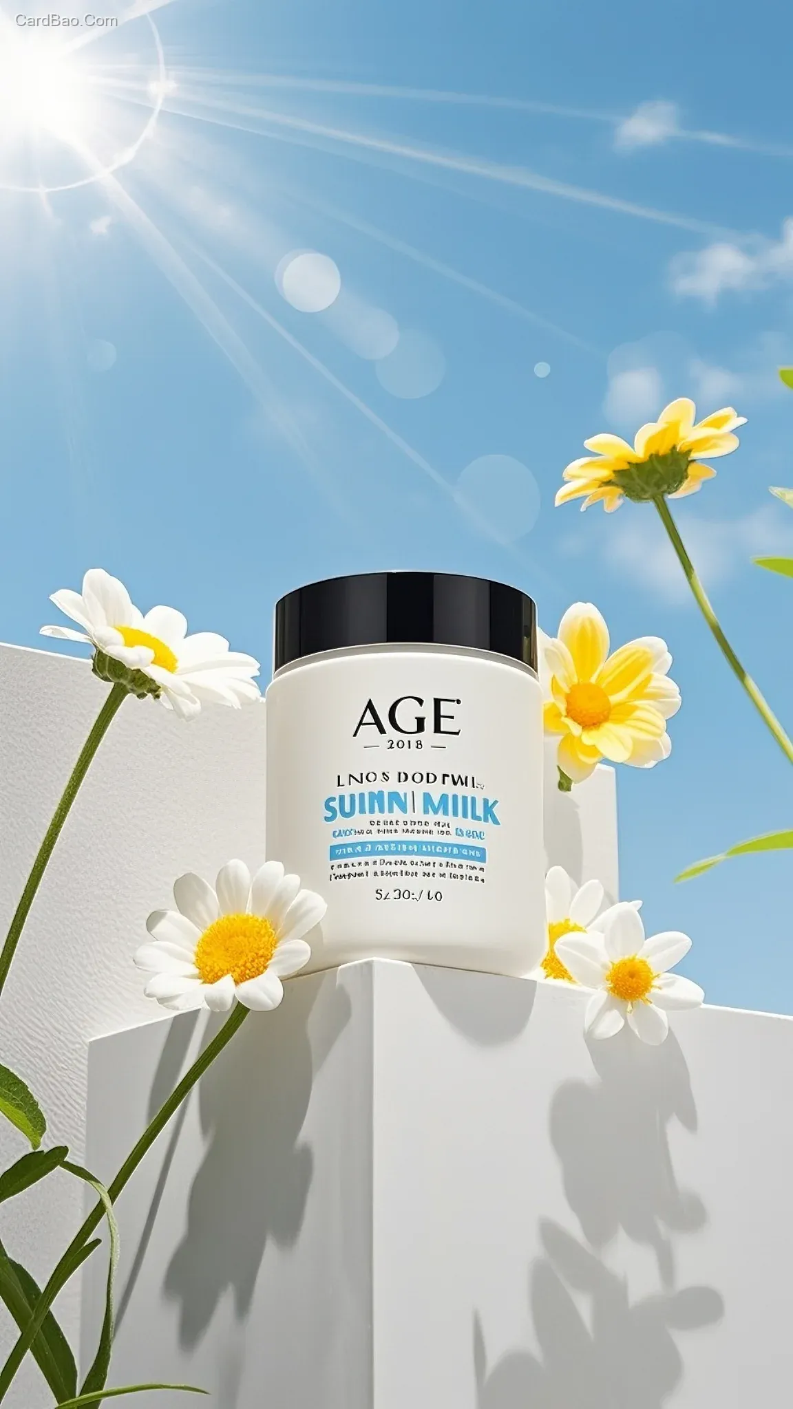 超写实摄影,展示 AGE 20's 防晒霜产品,圆柱形罐身带 “LONG PROTECTION ESSENCE SUNMILK SPF50 +” 文字、瓶身白色,盖子黑色。将产品置于白色立方体平台,平台上有鲜花点缀,背景构建晴朗蓝天,有太阳光线、云朵。强调光影清晰、色彩明快,营造清新户外防晒氛围,突出产品精致质感与防晒主题适配性 。
