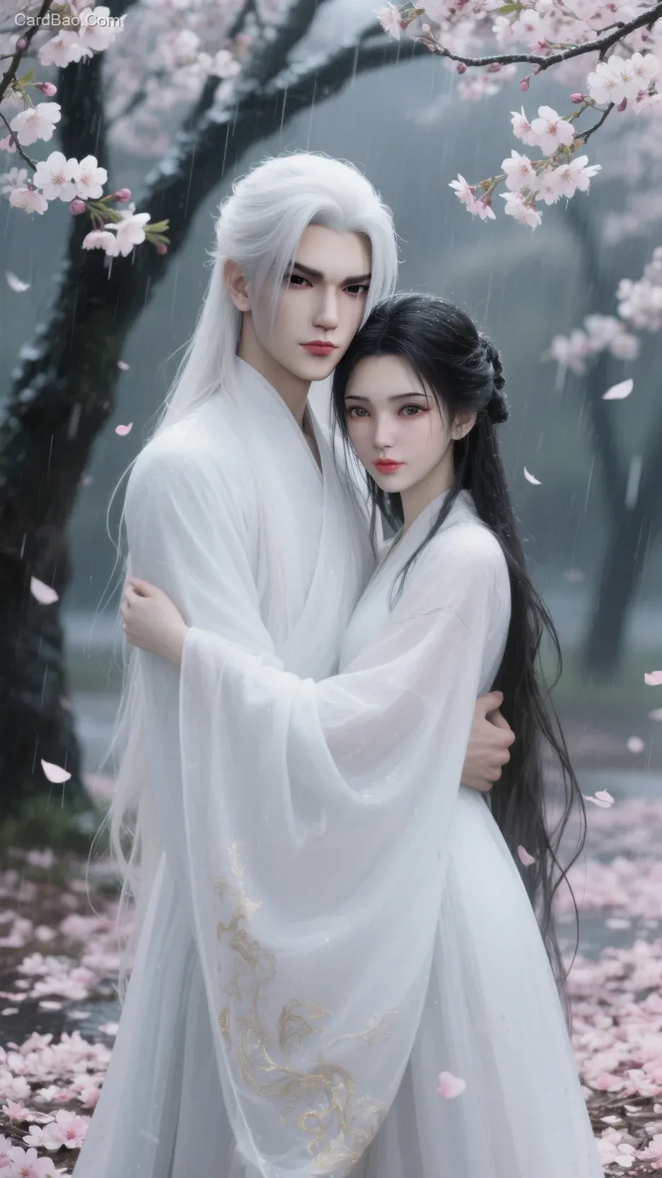 #### Ancient-style illustration, a grove of crabapple flowers, the ground covered with fallen petals, beneath a crabapple tree stands a man and a beautiful woman, a handsome white-haired man, embracing, full-body shot, a mature and elegant female figure, brushstrokes, clear lines, strong contrast between light and shadow, ultra-high definition, a sense of drapery, high-end aesthetic, facial close-up, highest quality. Translucent skin, strong lighting, delicate rendering, deep eye color like ink-stained cold pools, reflecting past sorrows yet utterly calm. Long eyelashes, slender cheeks, slightly prominent cheekbones, pale skin almost transparent, as if fragile to the touch, very faint lip color... detailed facial features. Rich details, a sense of soft blur, macro lens effect, facial shadows, facial focus, intricate details, stray strands of hair brushing the face, high quality, hyper-realistic, vibrant oil-painting texture, delicate textures, BJD-like, slightly turned face, raining... Moon-white wide-sleeved robes billowing in the cold wind, the hem embroidered with faint golden patterns, melancholic.
