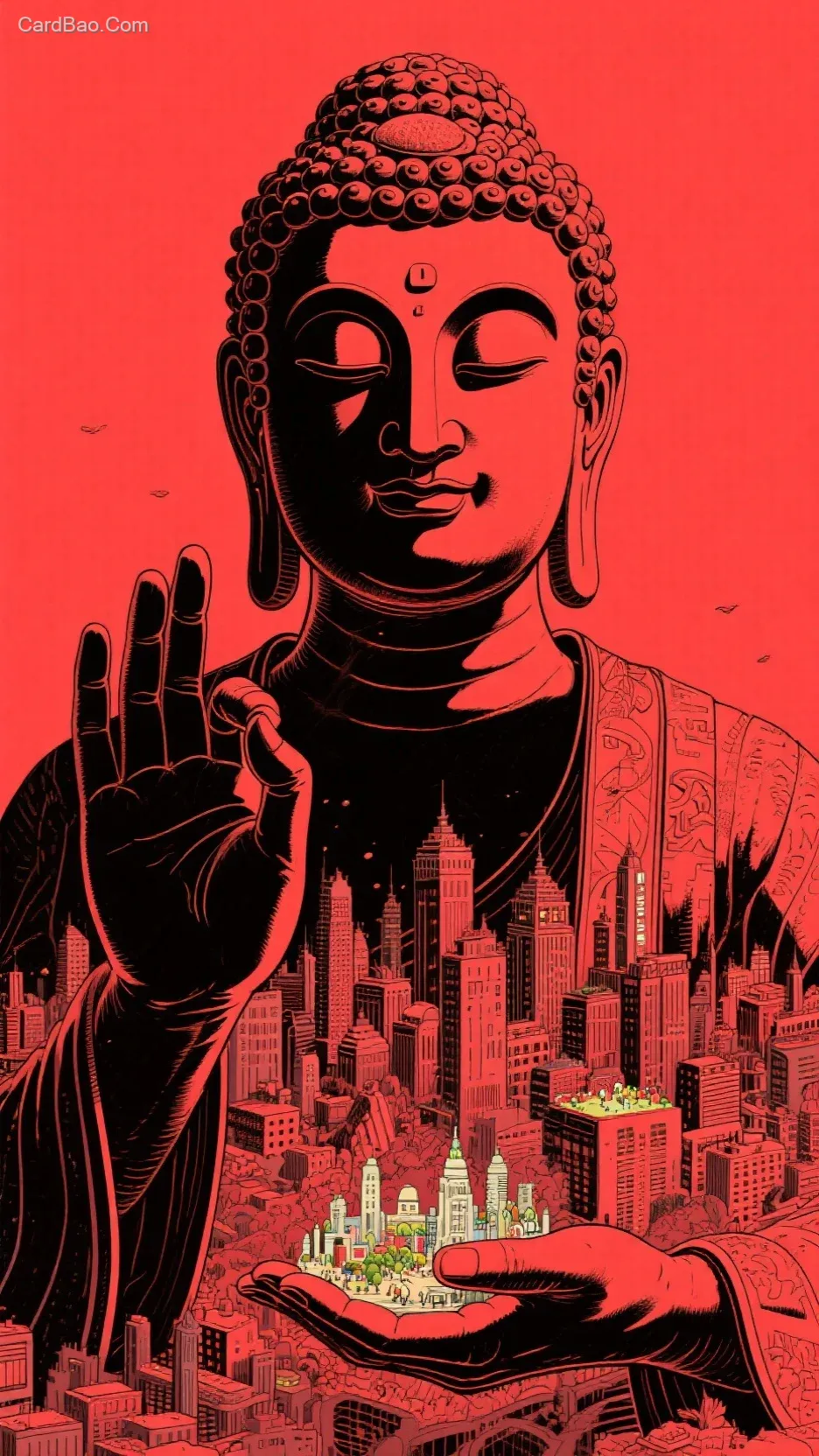 Moebius (Jean Giraud)风格,极繁主义,红底黑色描线,巨大佛陀 头部后方,左手竖起作佛教无畏印动作 , 右手平摊 掌中微缩小世界 有人有城市建筑,