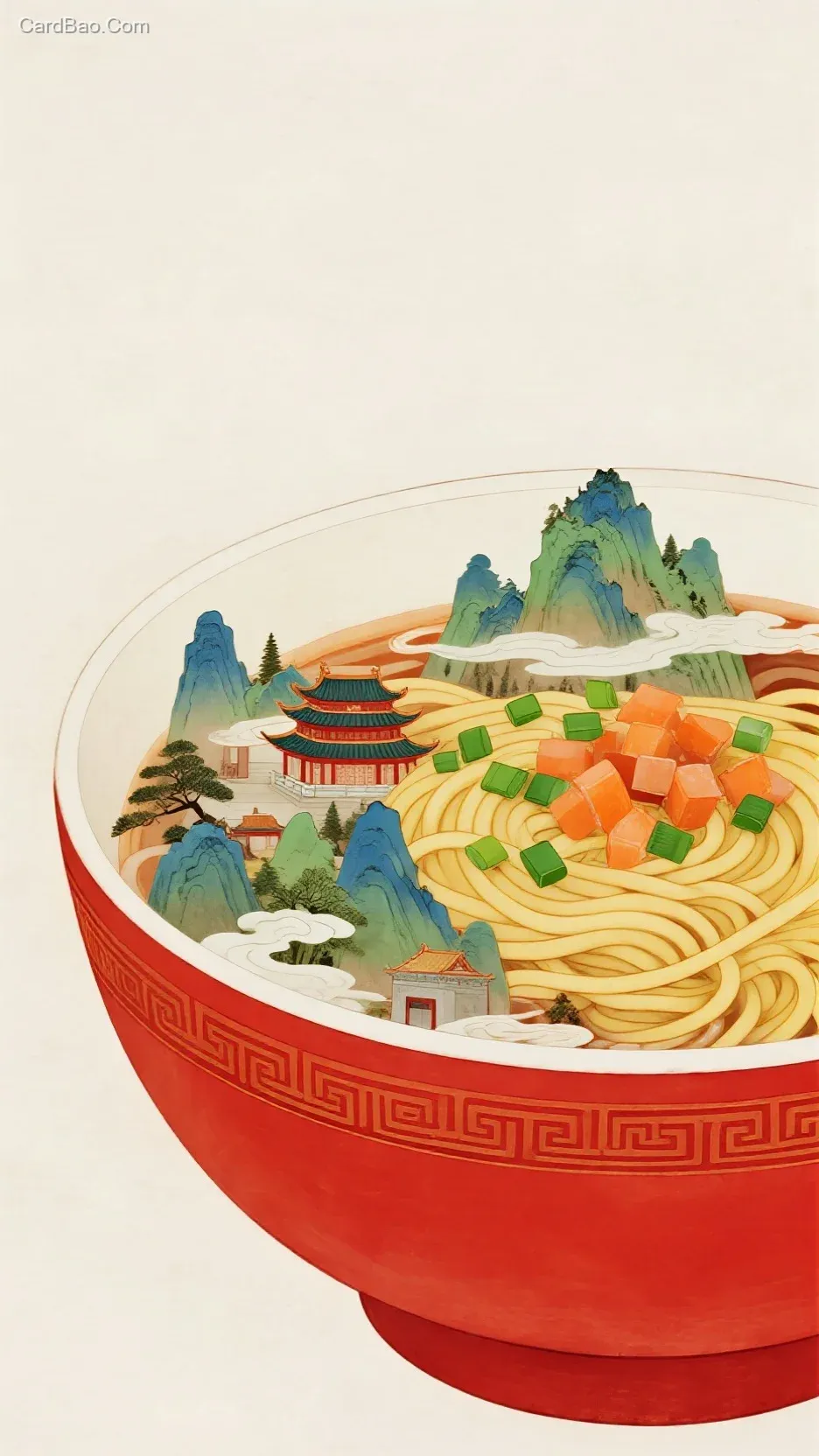 画面为平视的一只红色的大碗上面有战国时期的纹样。碗中盛着金黄面条,上面点缀着绿色葱花和橙色萝卜丁,碗内还有工笔勾勒层峦山峰,飞檐翘角的古寺楼阁和缭绕云雾的青绿山水。背景是无其它元素干净简洁的浅白色。