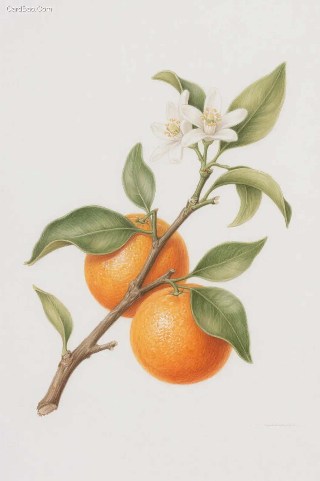 手绘,一枝丫的橙花和橙子,写实风格,彩铅,纯白色背景,大师级