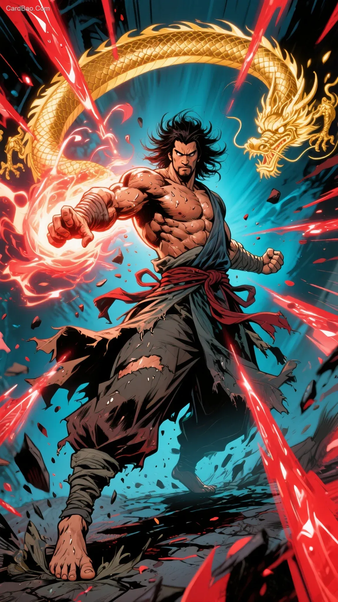 A full-body Hong Kong comic-style close-up of Qiao Feng in the moment of unleashing the "Eighteen Subduing Dragon Palms." His muscles are bulging and sharply defined like axe cuts, battle tattoos glowing, bare feet cracking the ground. A tattered cloth robe barely contains his steel-like physique as golden dragon energy rips through space. His furious eyes glare, wild hair standing on end. A low-angle shot intensifies the oppressive atmosphere. Strong Hong Kong-style contrast with bold red and blue clashes, thick ink lines, and flying sweat crystals. Eighteen dragon-shaped energy waves blast across the screen.
