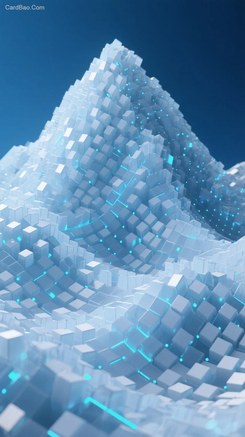 无数成千上万矩阵白色3D矩形汇聚成山体,随机,高低起伏,波浪,漩涡,无规律,满铺,简约,科技,毫米级,微米级,极小,密度极高,密集,发光蓝色科技线条,点,方块随机大小,随机高度,