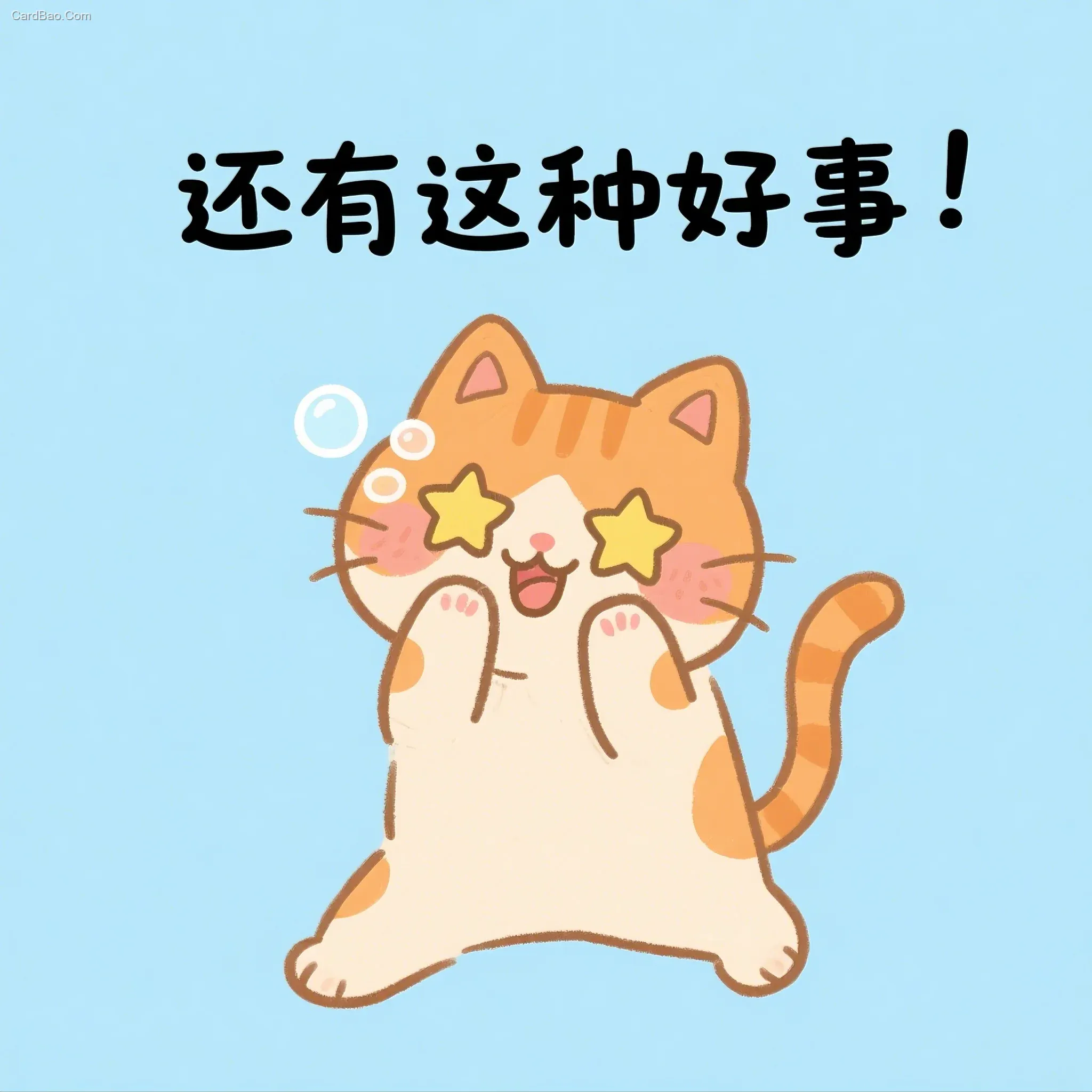 彩色简笔画,卡通风格,治愈系插画,生动童趣、手绘风笔触。拟人化小橘猫双眼变成星星状,双爪捧脸幸福冒泡泡,尾巴开心摇晃,背景浅天蓝色。空白处文字内容,文字在图片上方,文字要非常大,看得很明显:还有这种好事
