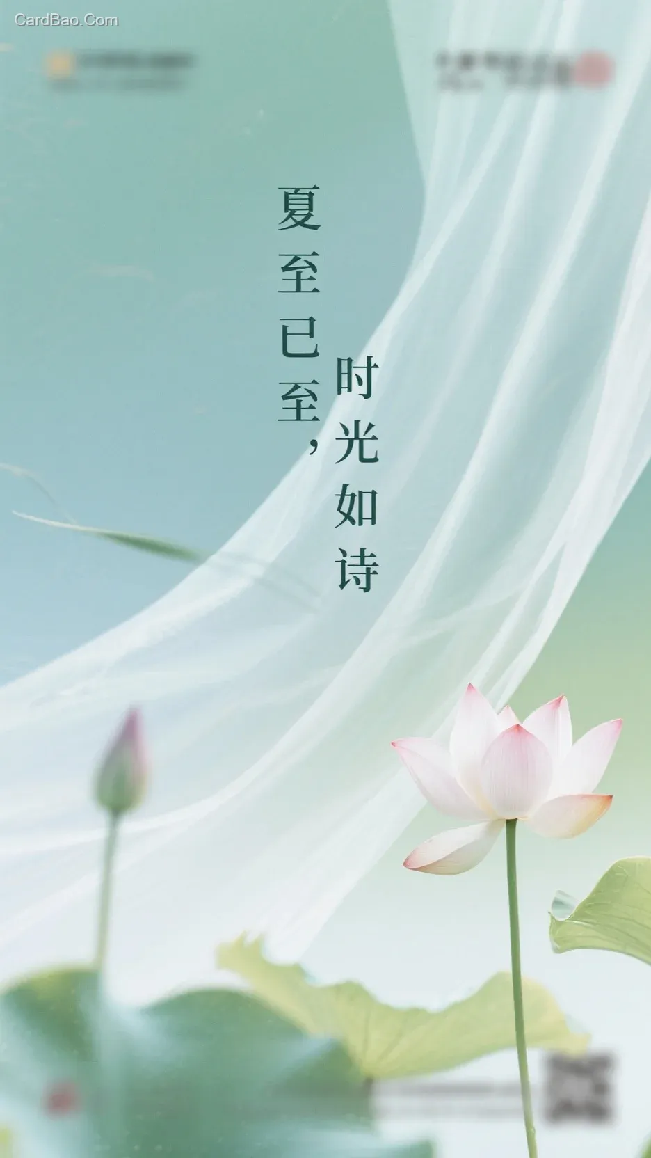 Summer Solstice 2025 poster, masterfully created, with the text: "The summer solstice has arrived, time is like poetry," featuring a strong artistic and literary vibe, suitable for pairing with soft summer elements (lotus flowers, gentle breeze), 8K resolution.