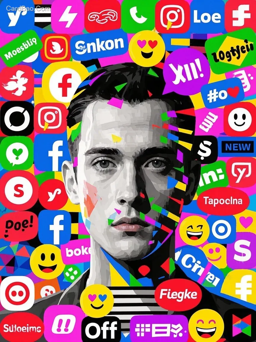 具有讽刺意味的、类似现代波普艺术或信息图形风格的海报。画面中心可能是一个表情麻木或空洞的人物头像,但他的整个面部和背景被无数色彩鲜艳、快速闪烁、层层叠叠的现代消费品牌Logo、社交媒体图标、网络流行语、表情符号所完全覆盖或淹没。各种符号混乱、拥挤、争夺注意力。色彩极其饱和、繁杂、甚至刺眼。构图饱满、缺乏焦点,营造出信息过载、消费主义和符号轰炸的压迫感。