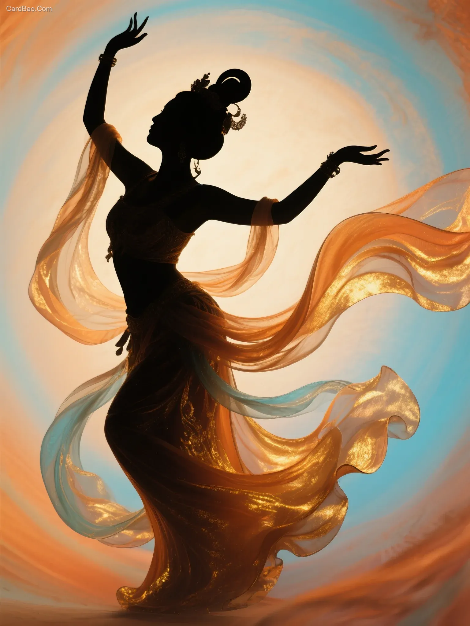 跳舞的古风女人剪影,敦煌色系,凹凸有致,玲珑曼妙,敦煌舞姿,高对比度,丝绸质感雾状肌理,轻微径向渐变。橙蓝金相间,流动感。极致华丽神秘气息