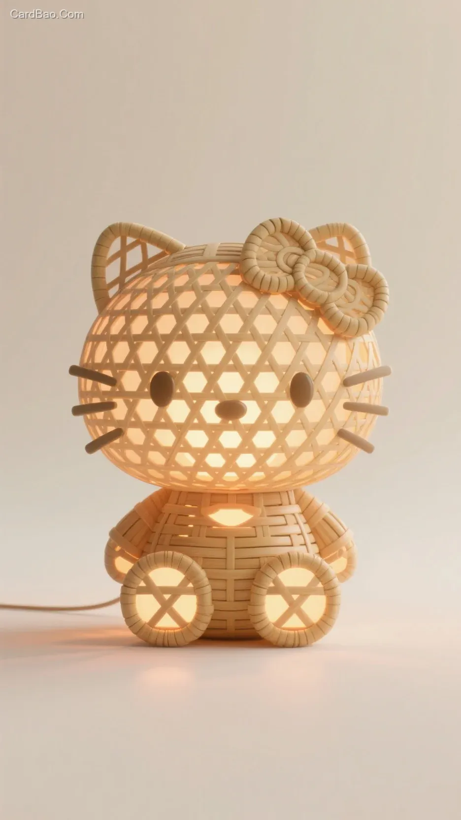 一只竹篾编织的发光开心helloKitty形象的造型灯,文创产品,精细刻画,竹篾编织,竹篾材质,传统工艺,手工编织,细腻的竹篾,环保设计,立体镂空结构,内部发出暖色灯光,C4D模型,3D建模,辛烷值渲染,虚幻引擎,高级感,前卫的概念设计,立体感,景深,米白色的背景,丁达尔效应,光影,内发光,生物发光,超精细刻画,超高清,高质量,8k,肌理磨砂,罗尔纯