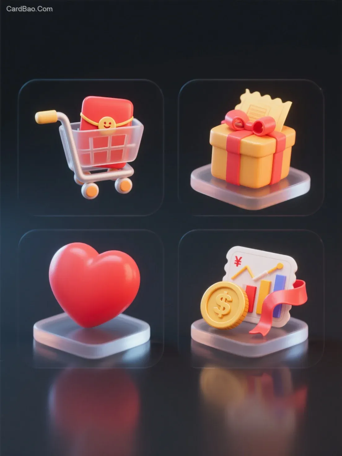 Generate a 3:4 ratio four-grid high-quality lifestyle icon set, with each icon featuring shopping-related items (such as shopping carts, red envelopes, gift boxes, coupons, coins, charts, ribbons, red hearts, etc.). The icons should have rich lighting and shadows, vibrant colors, and be presented in a unified 3D acrylic surface style with a blurred background. Use C4D high-gloss photorealism, resembling iOS emoji. Each icon should be delicate and compact, set against a clean dark background with a floating effect.