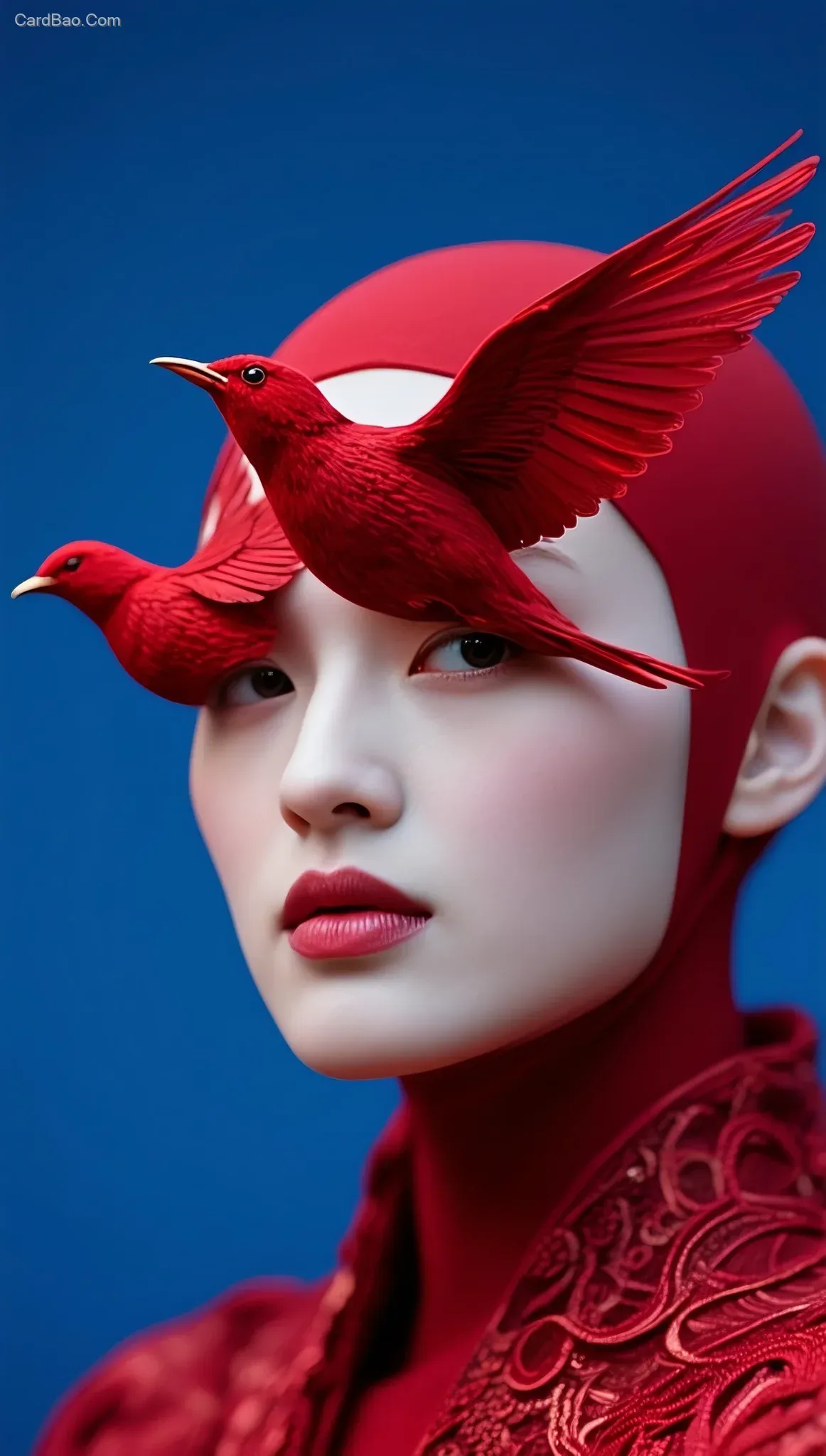 ##"Keep the same composition, no text, numbers, or letters in the frame, cinematic montage style, skin with a matte porcelain-white texture, extremely refined, vivid and natural details, high dynamic range imaging, 8K ultra-high-definition quality, Klein blue background, low noise"