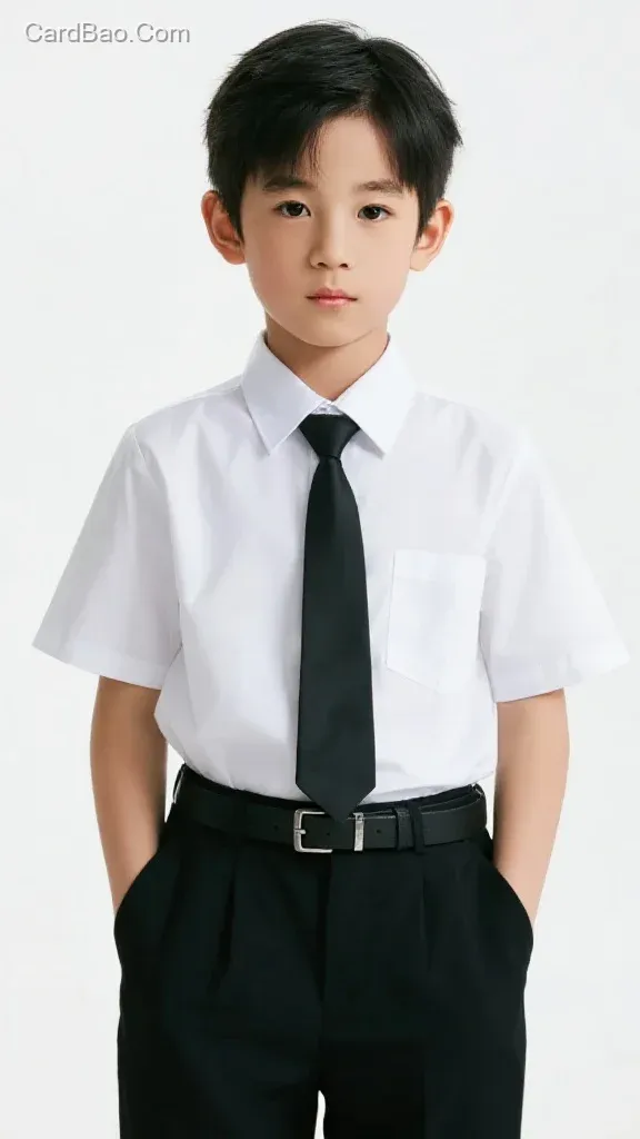 图片为人像摄影,中国10岁男童,穿着衬衫短袖上衣,黑色西裤,迷黑色皮带站着,纯白色背景