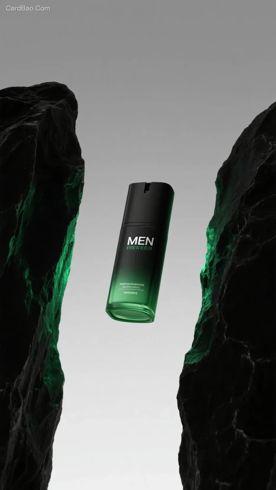 高级海报摄影,摄影棚拍摄,主体是一瓶黑绿色渐变的男士面霜,主体漂浮在两块巨大的贯穿画面的黑色岩石中间,灰色背景,石头发出绿色的光,大面积留白,居中构图,男士风格,硬朗,4K