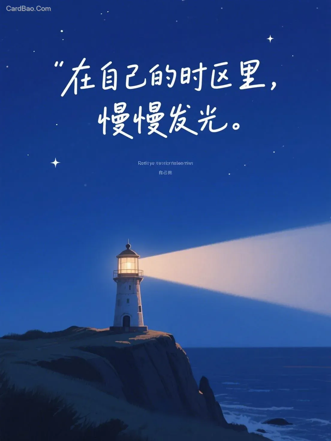 "In your own time zone, shine slowly." A healing-style text poster with quiet and steady handwritten calligraphy. In the aesthetic illustration style of a serene night, under a tranquil deep-blue starry sky, only a small vintage-style lighthouse stands alone by the shore or on a cliff, steadily emitting its own soft and warm beam of light, illuminating a small area around it. The atmosphere is peaceful, calm, independent, and full of inner strength.