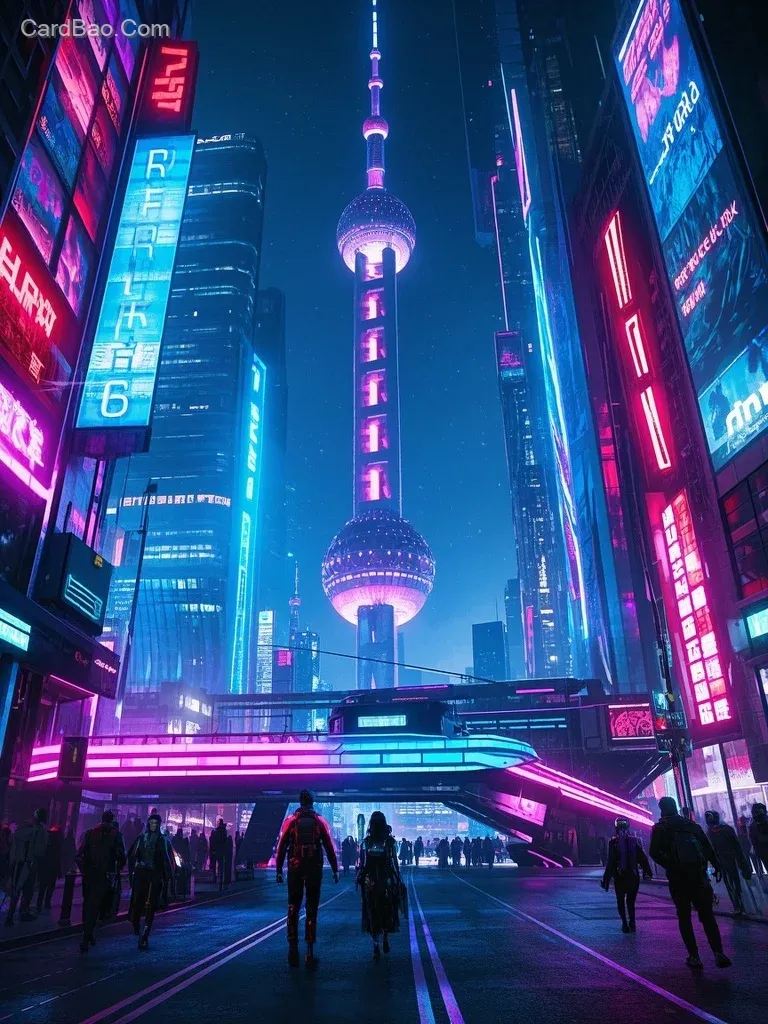 一张充满赛博朋克风格的上海街头景象。背景是霓虹灯闪烁的高楼大厦,街道上布满全息广告屏幕和动态光影。
