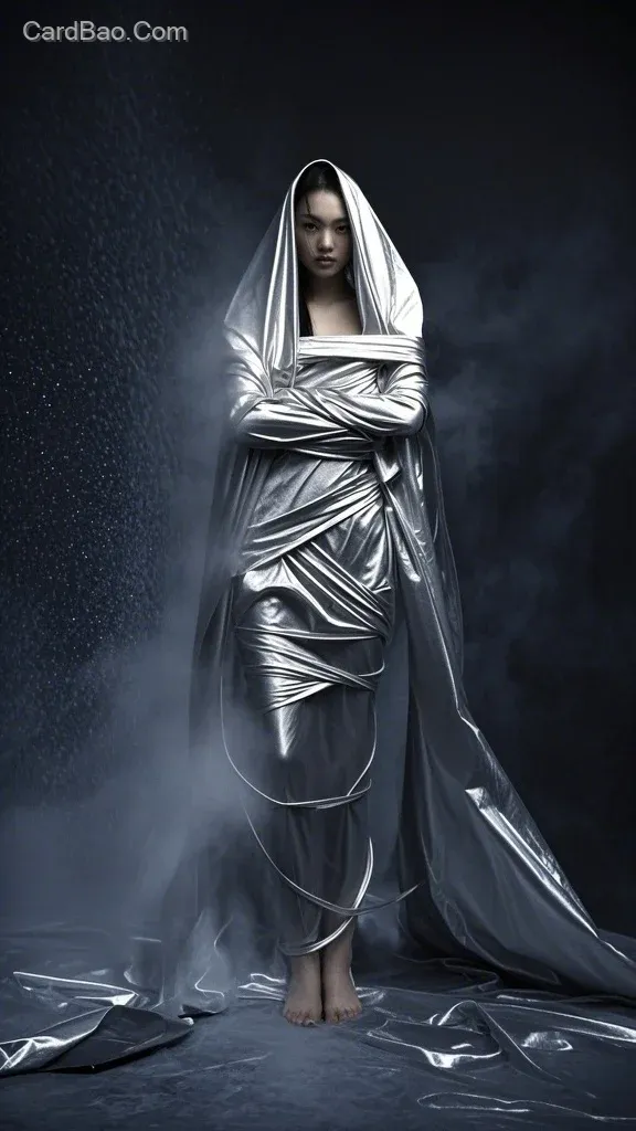 Stream of consciousness, dreamcore, artistic photography, award-winning work, sense of blur, pronounced bokeh effect, minimalism, melancholic, decadent, surrealistic portrait photography, entire body wrapped in long opaque silver fabric being pulled from all directions, strong visual tension, blurred lens, immersive atmosphere, background in dark blue with grainy layers, high-end aesthetic.