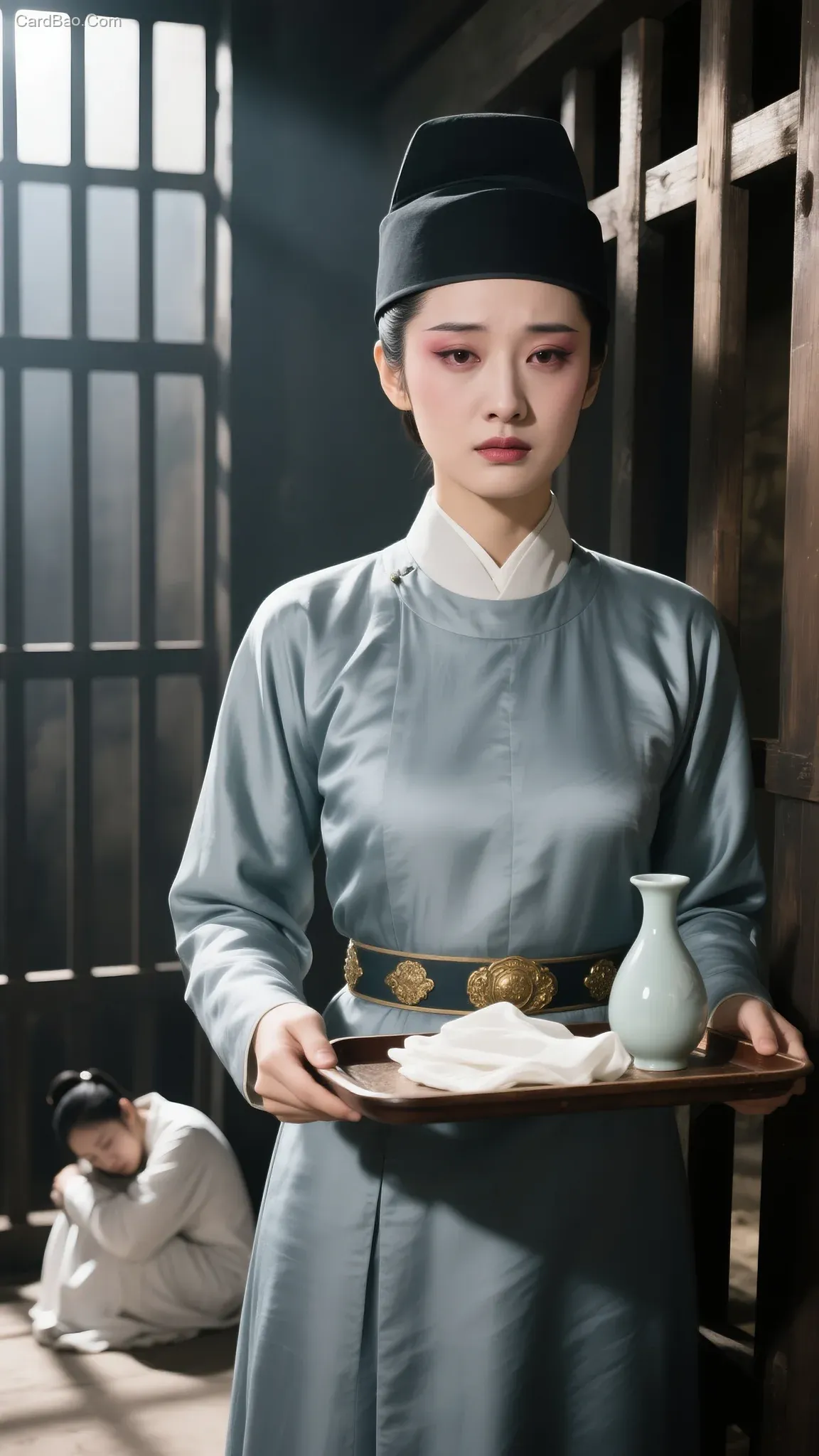 Film shot, classical makeup, willow-leaf eyebrows, phoenix eyes, eyeshadow, blush, delicate and refined facial features, exquisite facial contours, a beautiful woman with delicate skin texture, disguised as a man, wearing a yuanwai hat, a busty figure in a tight-fitting grayish-blue silk round-neck shirt, cinched waist, gold-inlaid jade belt, holding a tray with white silk and a wine jug, a sorrowful expression. In the corner behind her, a stunning female prisoner in white clothes is curled up, a prison cell with wooden bars, backlit.