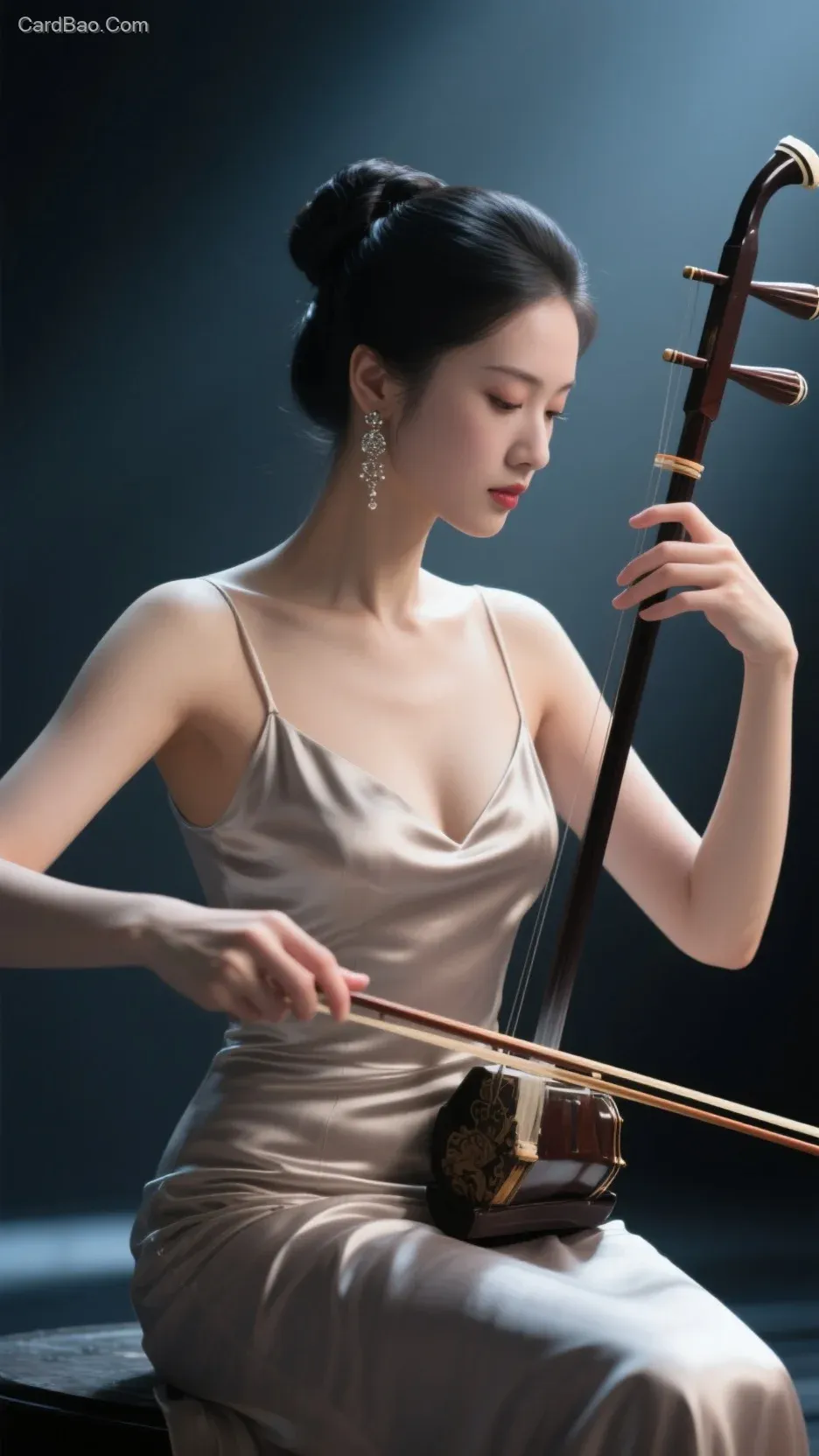 Under the soft stage lighting, a woman with jet-black coiled hair wears a form-fitting, low-cut silk slip dress and delicate earrings, intently playing the erhu. The close-up captures her cool side profile, enraptured expression, the agile movements of her bowing and fingering hands, and the elegant lines of the erhu. Rendered in 3D at 32K ultra-high definition, professional lighting accentuates her graceful waistline and silhouette, highlighting the charm of Eastern aesthetics and artistic allure.