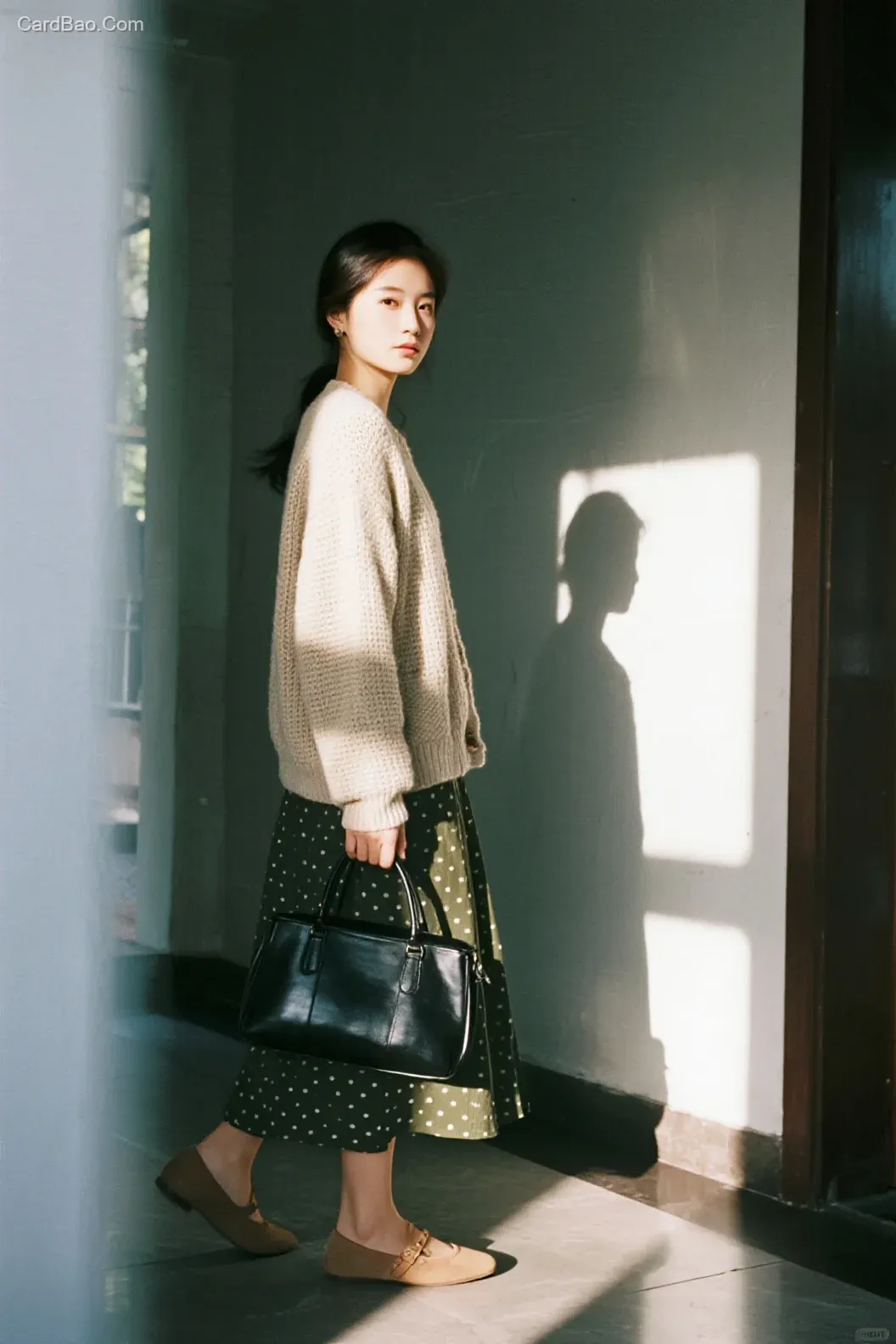 高质量街拍写真,清新自然风格,平视镜头构图,柔和自然光影。女子身着米色针织开衫+墨绿色波点长裙+浅棕色平底鞋+手持黑色手提包,侧身站立姿势,鹅蛋脸型五官精致,表情恬静优雅,展现室内文艺氛围;超强胶片颗粒感,自然无美颜,主体人物曝光过度压低周围环境,