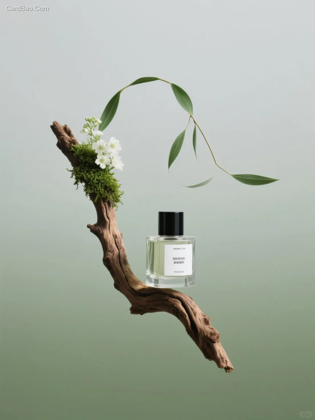 Creative product display, artistic feel, premium aesthetic, minimalist beauty, gradient background color transitioning from light green at the top to light gray at the bottom. A curved wooden branch floats in mid-air, adorned with green moss and white flowers. Slender, winding leaves coil around the branch. In front of the branch sits a transparent glass perfume bottle with a white label bearing black text. Still life photography, commercial photography, high-end photography with an elegant and subdued tone, ultra-sharp, best quality, high-definition.