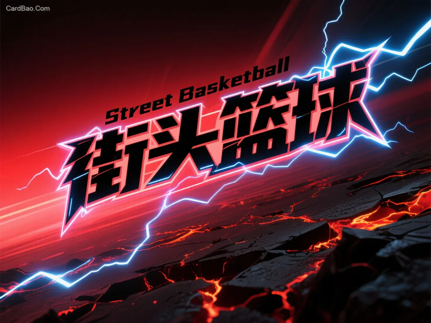 "街头篮球",电竞动力风格,黑红渐变赛博背景,尖锐斜角字体结构,笔画末端能量脉冲特效,字体内部嵌流动光刃效果,高亮电流边框环绕,立体错位层叠排版,暗部熔岩裂纹质感,强烈红蓝光效对冲,竞技速度感与爆发力,未来科技艺术张力,杰作