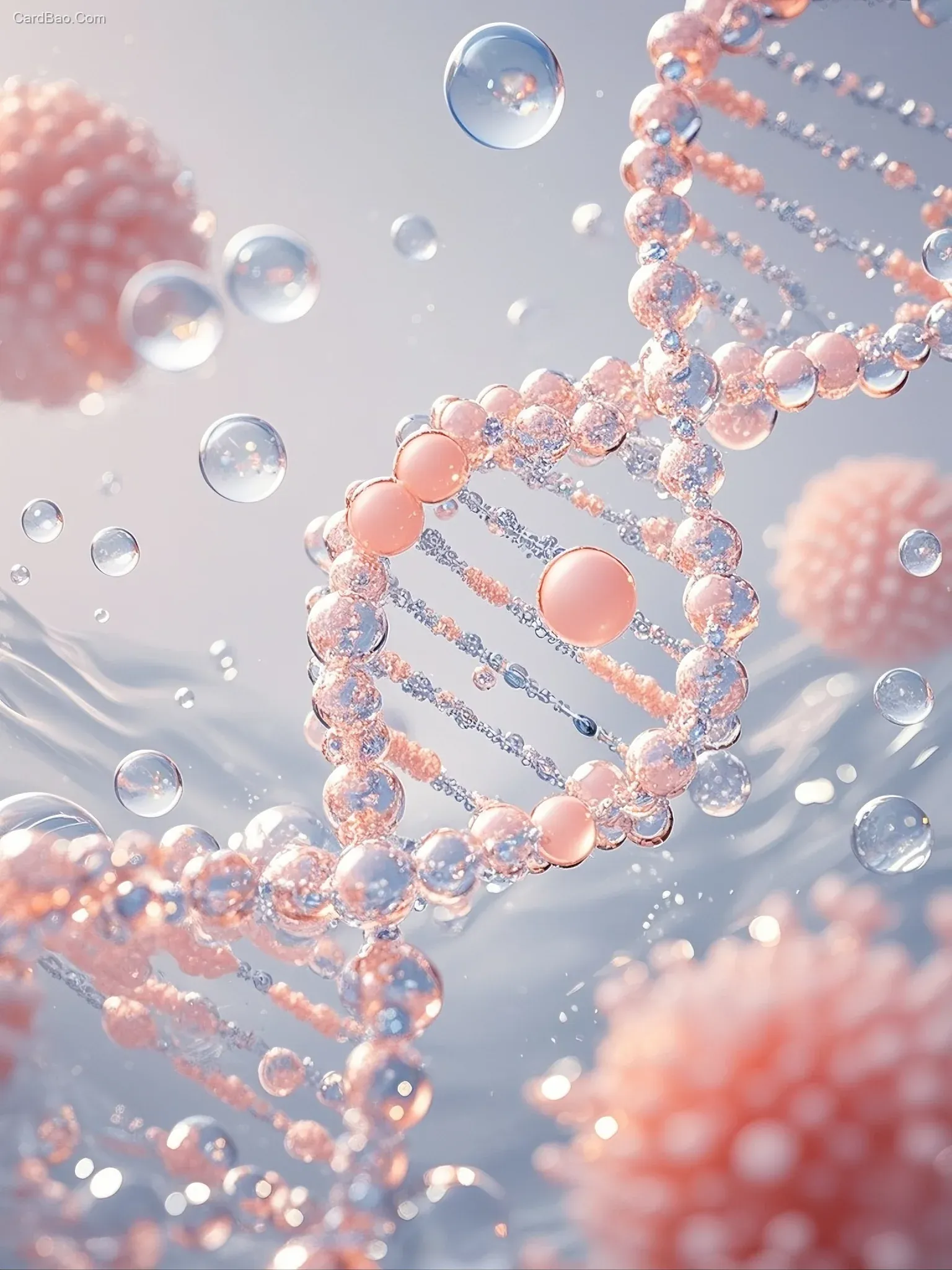 清澈的粉白色背景,漂浮着水珠、气泡和液体波浪,形成DNA链的形状,多个分子,有细胞和基因悬浮在空中。整个场景充满了柔和的色调、光线反射效果,具有极简主义风格、高清摄影、3D渲染、高分辨率、高细节和深度感。oc渲染