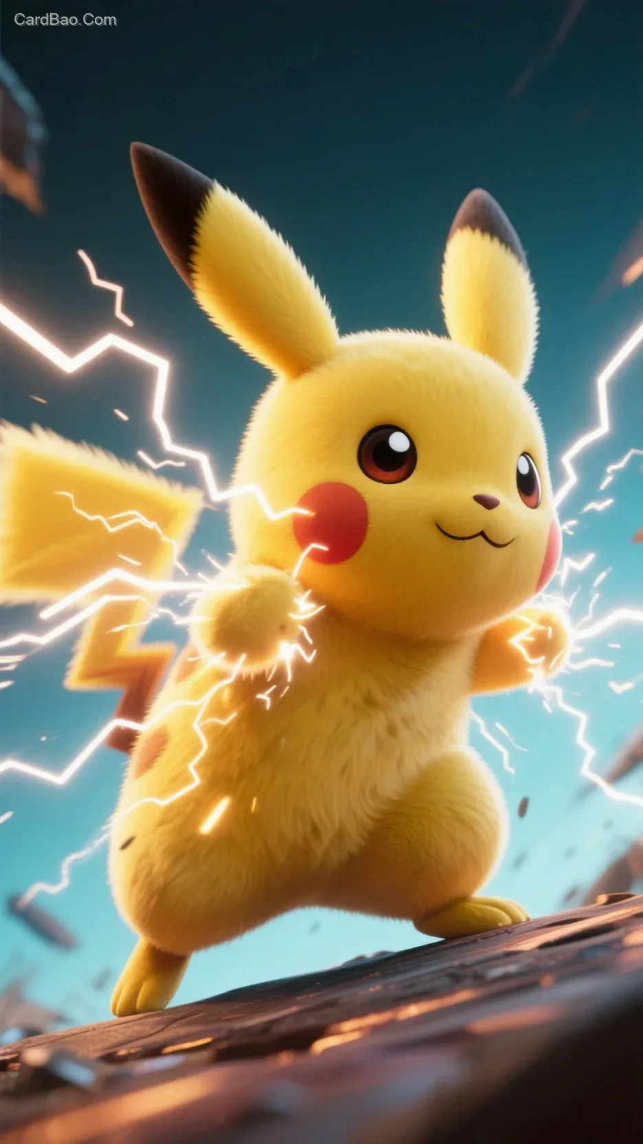 3D神奇宝贝,皮卡丘特写,竖起耳朵,释放十万伏特技能,脸颊释放电流,电光粒子特效四射,低角度仰拍强化体积感,渐变背景烘托战斗氛围,3D卡通渲染风格,动态构图增强冲击力,景深虚化突出主体,高分辨率贴图材质,光线追踪反射效果。