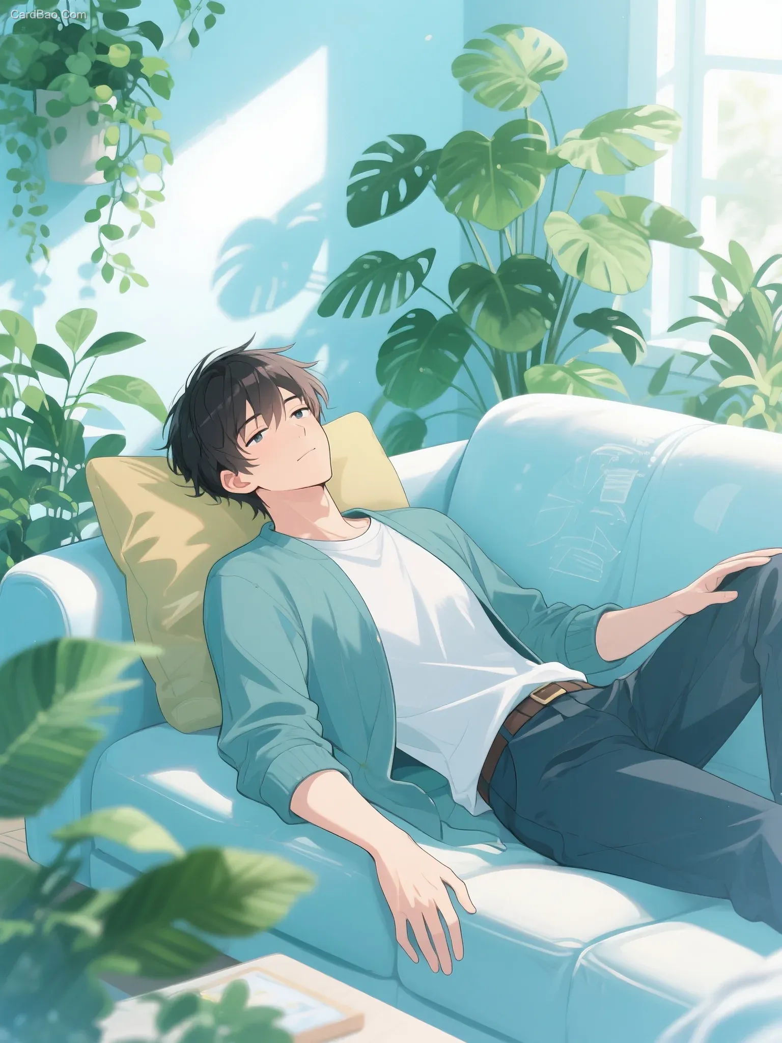 Lazy-style male lead, green plants, sofa, light blue tones. Close-up shot.