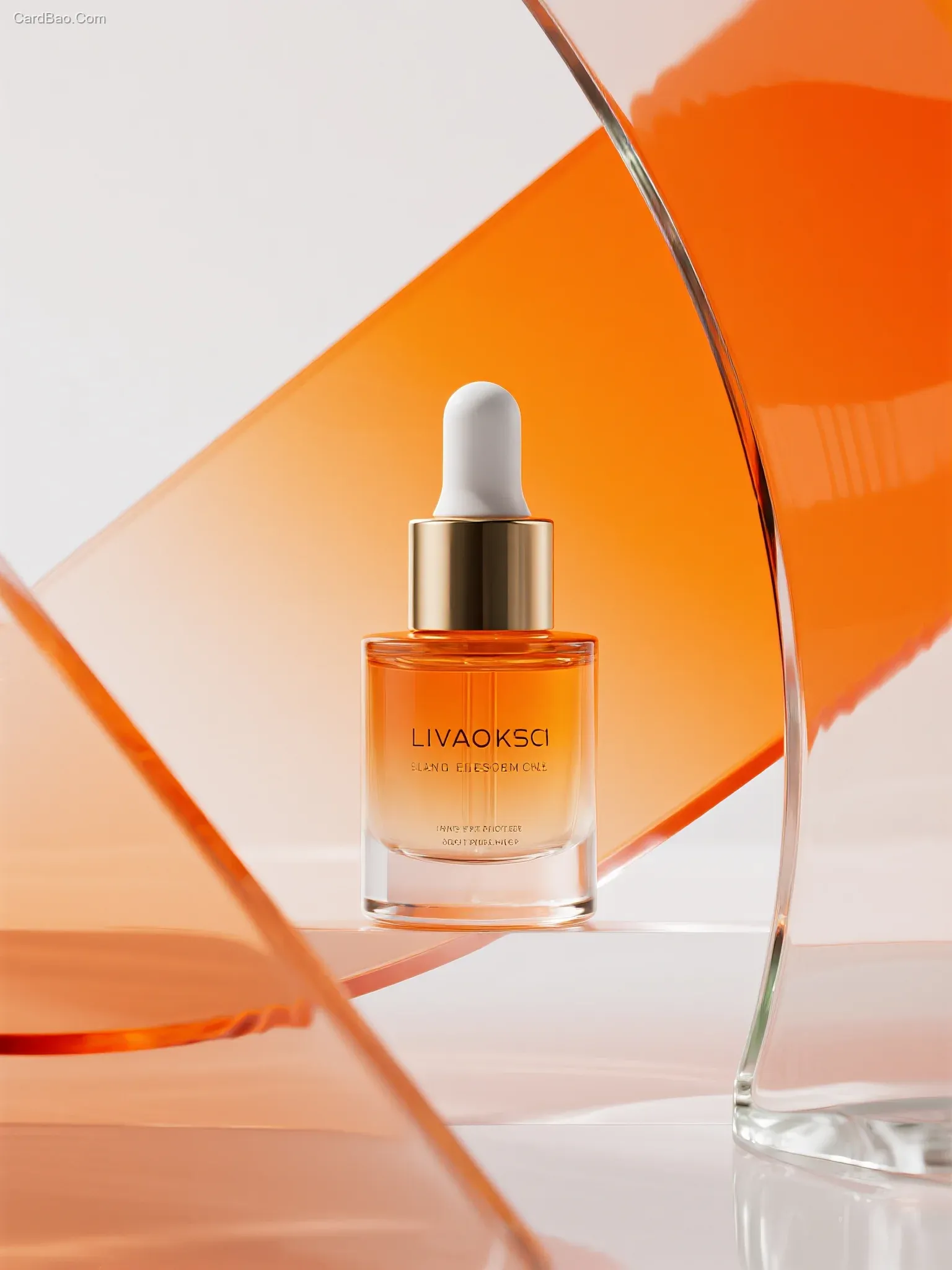 Skincare product advertisement shoot featuring a skincare serum, with background elements of solid orange-to-colorless transparent gradient glass, low-saturation orange-to-white gradient background, clean backdrop, Octane Render, Cinema 4D rendering, high-definition, 8K resolution.