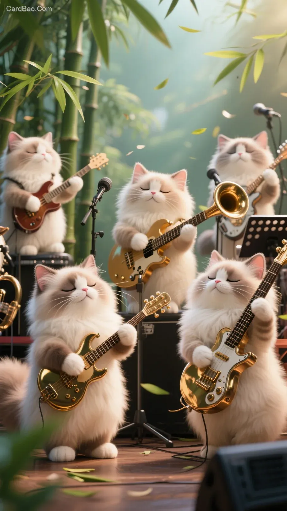 Theme Description: A group of adorable ragdoll cats holding a concert, each playing different musical instruments. The kittens have fluffy, soft fur, eyes closed in rapture, with bamboo leaves drifting in the wind.
