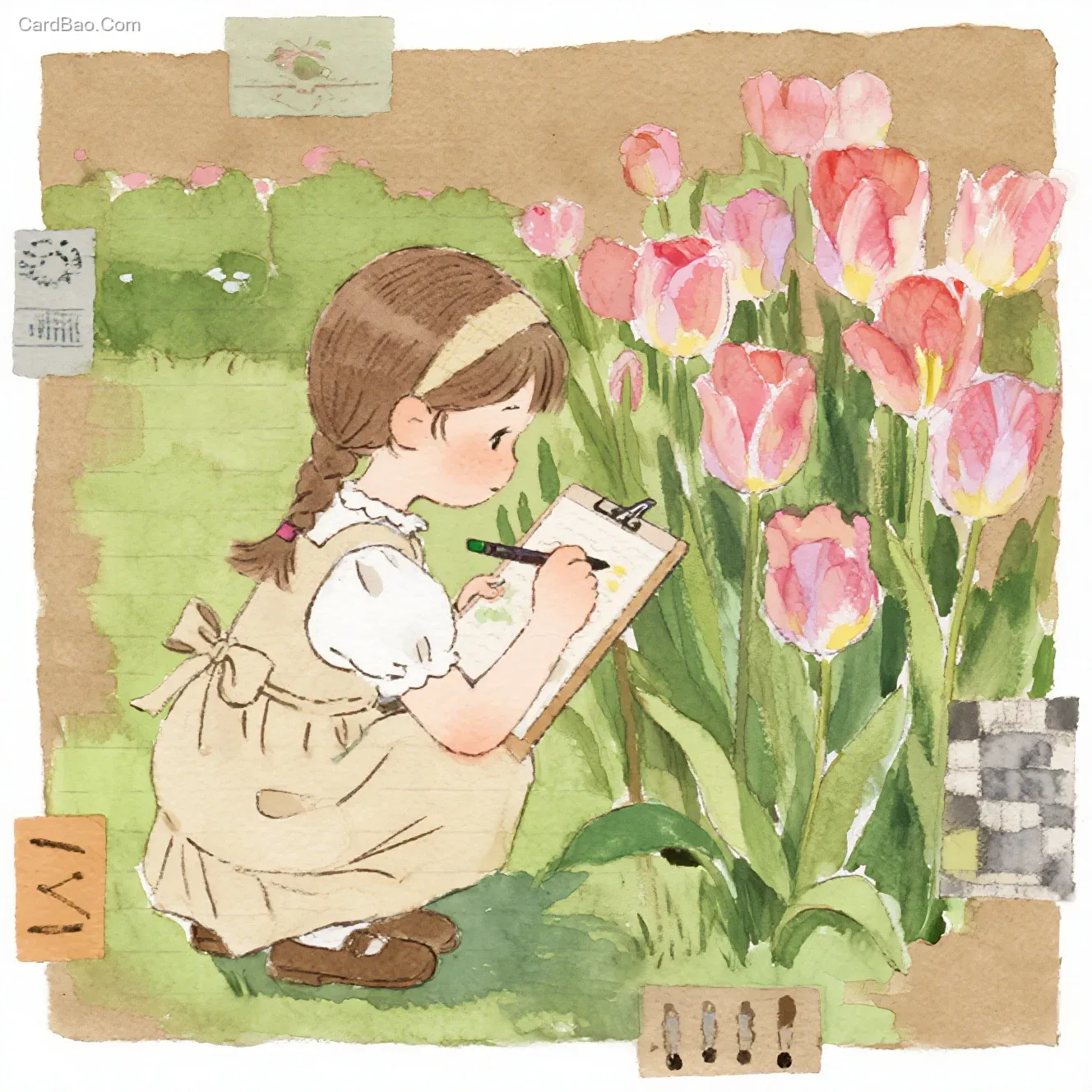 小女孩蹲在淡粉郁金香花丛写生,亚麻色连衣裙,水彩笔触花瓣,牛皮纸背景,手账拼贴风