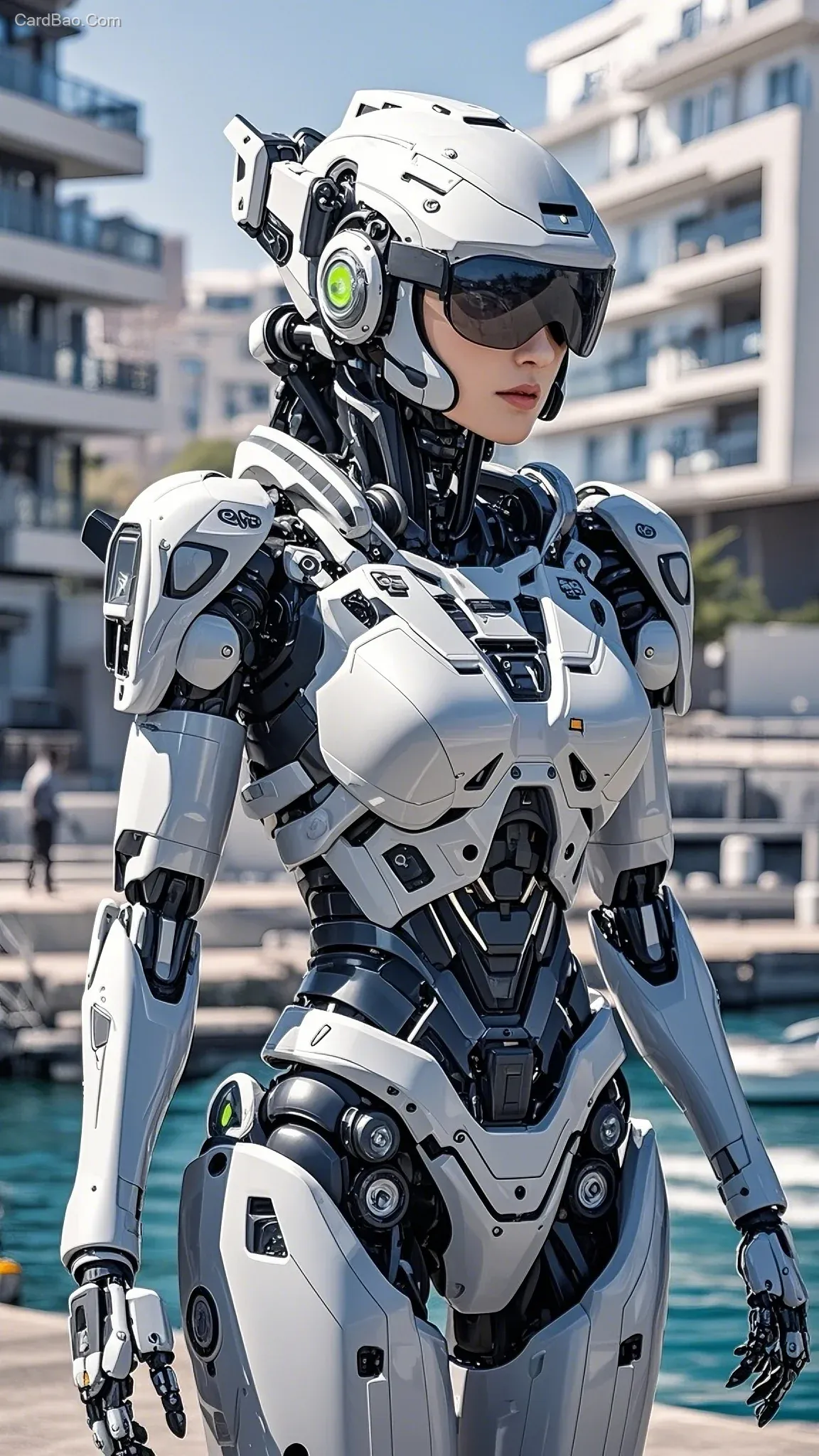 A futuristic female robot mecha patrols the harbor, featuring highly realistic housing and equipped with high-tech gear, vigilantly monitoring its surroundings.