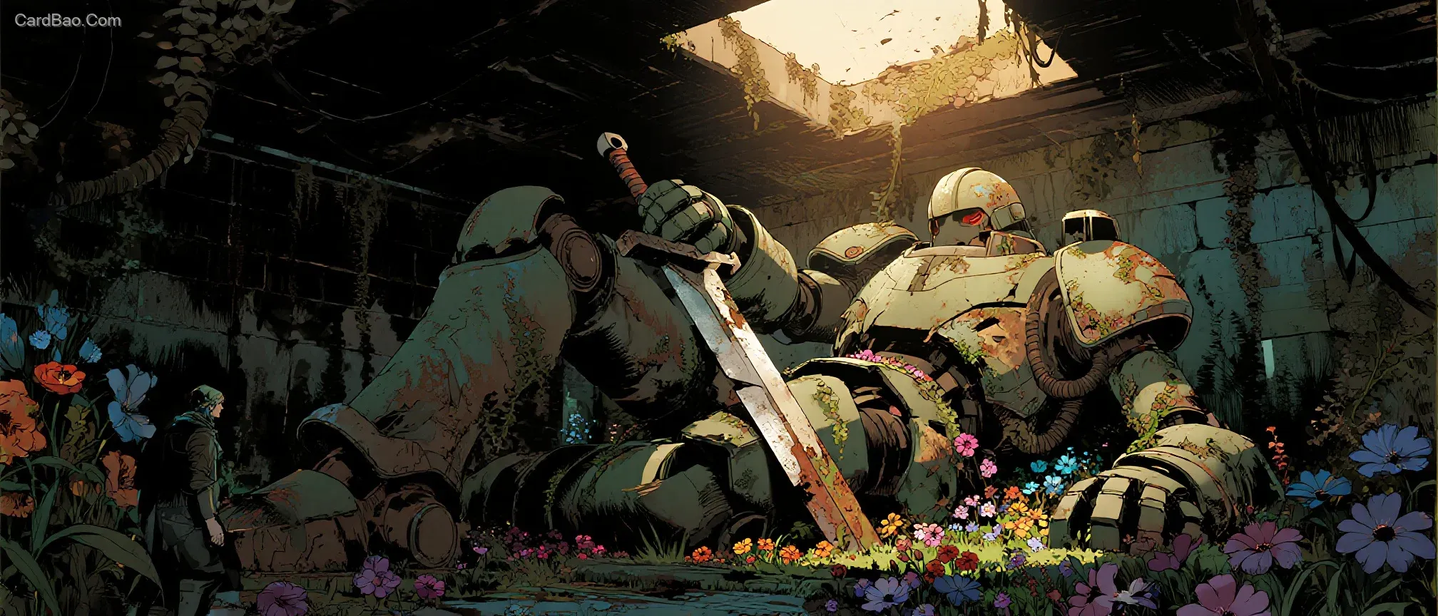 Moebius (Jean Giraud)风格,极繁,细致,昏暗的地下,一个巨型机甲失去了能源靠在墙上,机甲受损,机甲身边有一把破损的巨剑,破旧感,锈迹,周围开满五颜六色的鲜花,机甲身上长满了鲜花藤蔓。头顶的缺口处灰尘映衬阳光照射在机甲身上,左下角主角,巨物感,仰视角,不对称构图,全景图。