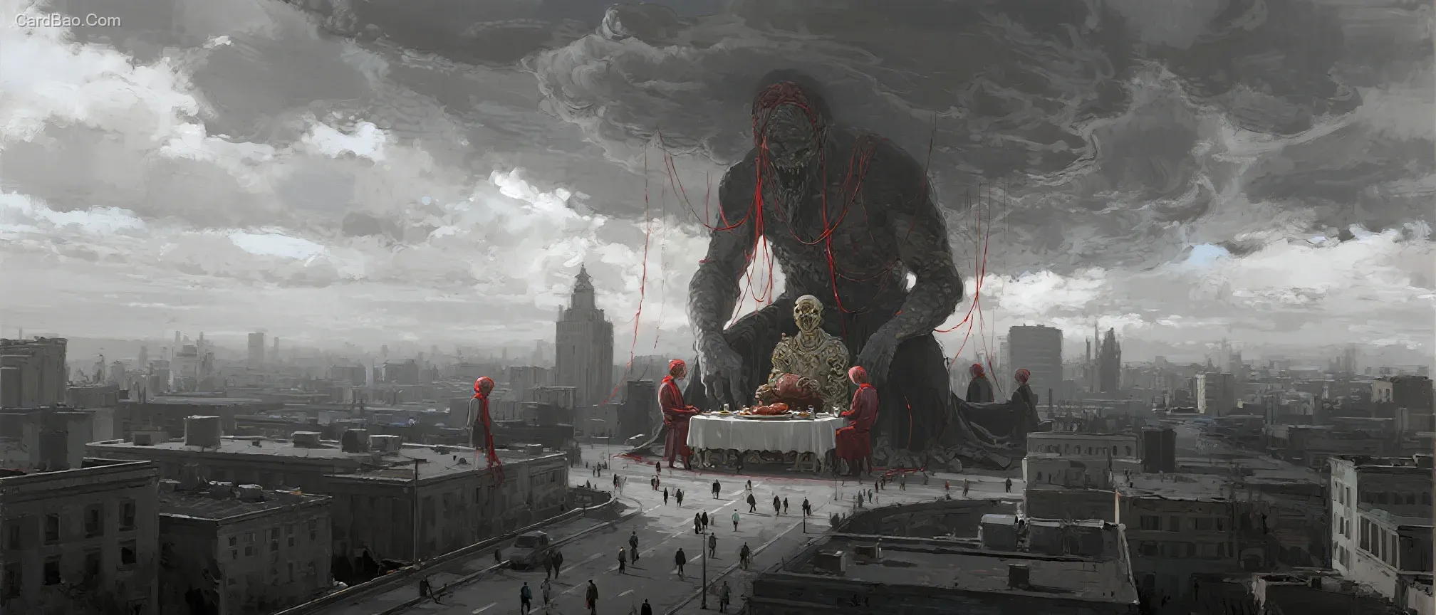 A modern city with numerous tiny pedestrians on the streets, their heads connected by crimson threads stretching into the hands of a colossal demon hidden within thick clouds. The scene exudes realism, with towering, layered clouds in the sky. Above the dense, overlapping clouds, a terrifying monstrosity composed of piled flesh and blood looms faintly visible, dominating the upper half of the composition with overwhelming presence. The enormous demon sits before a grotesquely elaborate dining table, indulging in a gluttonous feast. The table beside the demon is designed with sinister and heretical carvings, exuding an eerie, dissonant, and abnormal aura. The atmosphere is intensified with horror, captured through a wide-angle lens. The painting features visible brushstrokes, enhancing the terrifying ambiance, rendered in acrylic paint.